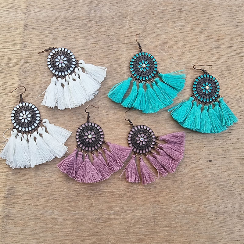 Brighten up your day with these on-trend boho style tassel earrings in a fan design.