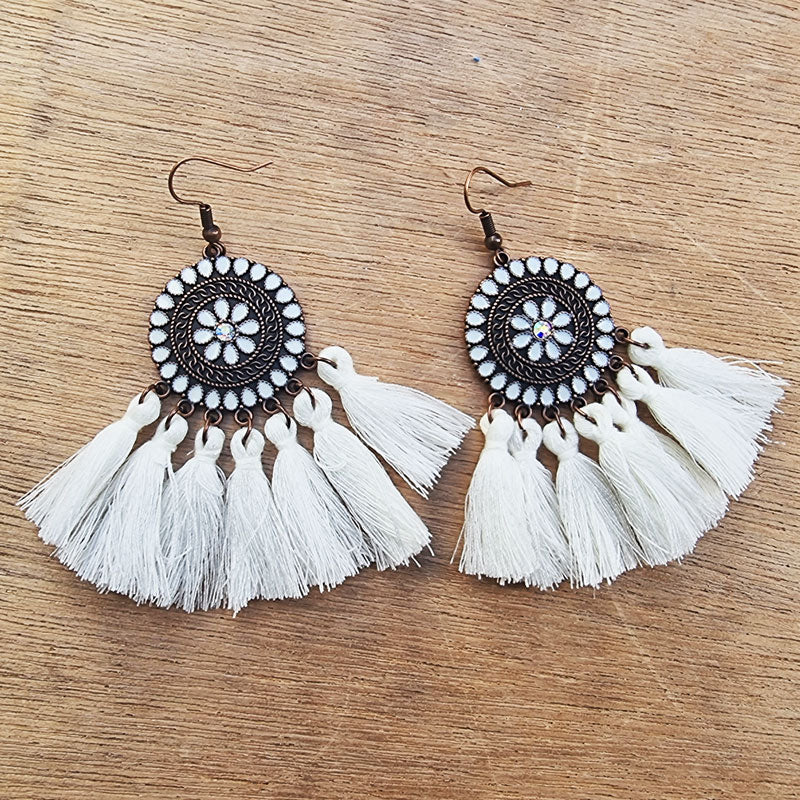 Boho Tassel Fan Earrings - White