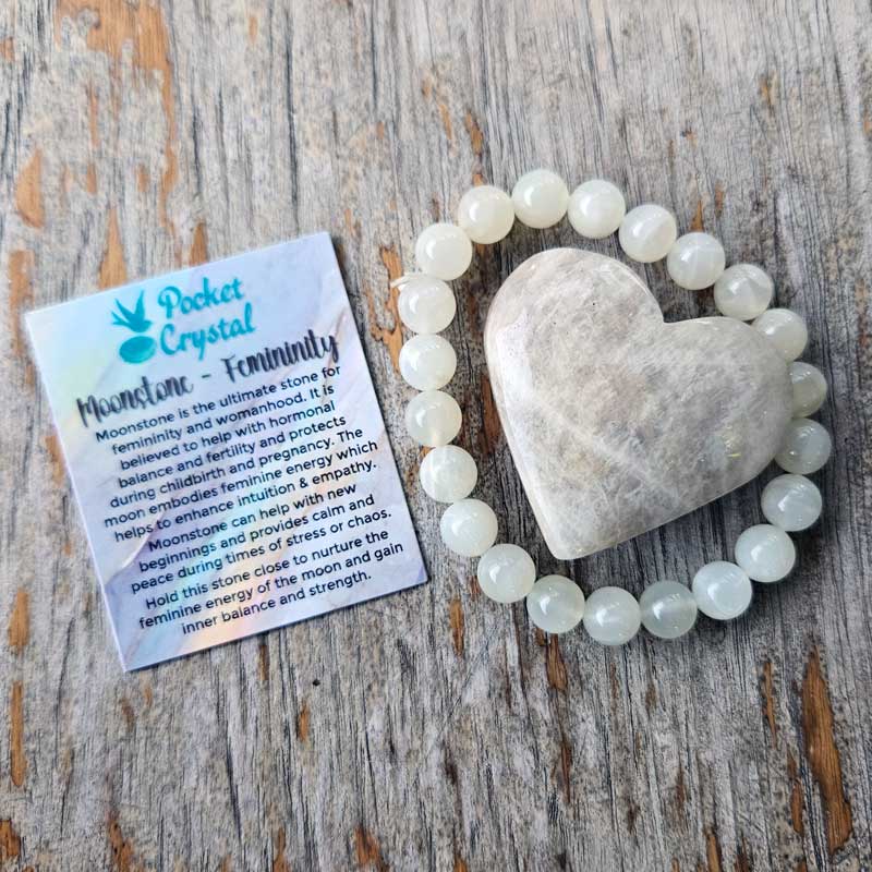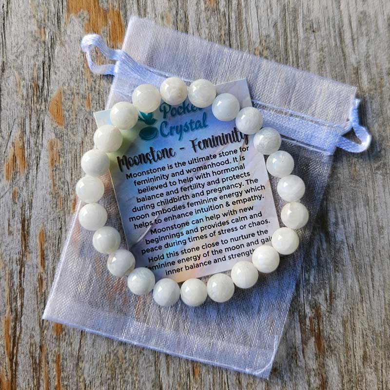 Moonstone is the ultimate stone for femininity and womanhood. It is believed to help with hormonal balance and fertility and protects during childbirth and pregnancy. The moon embodies feminine energy which helps to enhance intuition & empathy. Moonstone can help with new beginnings and provides calm and peace during times of stress or chaos.