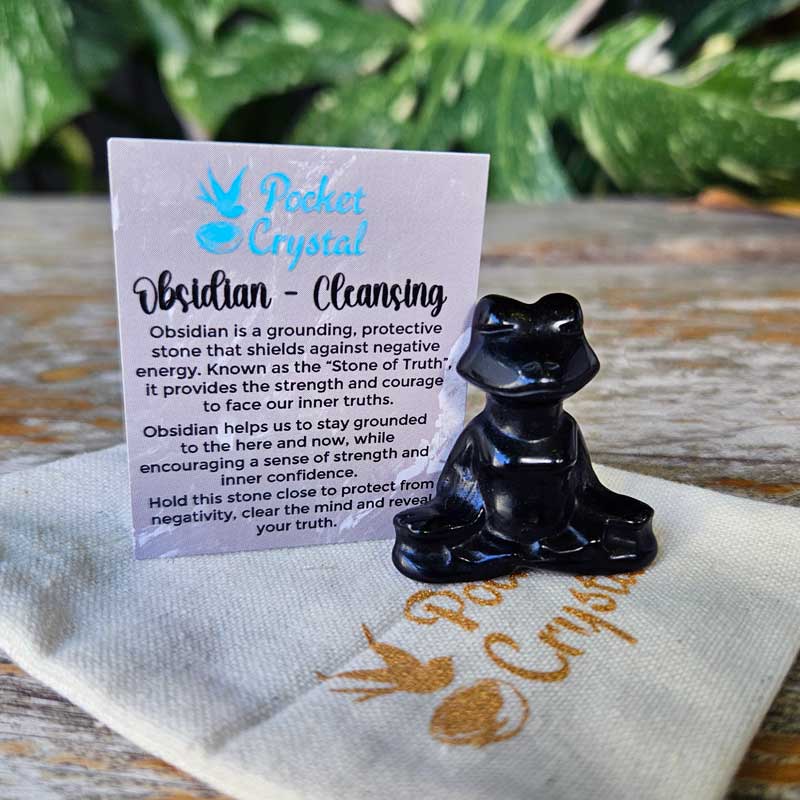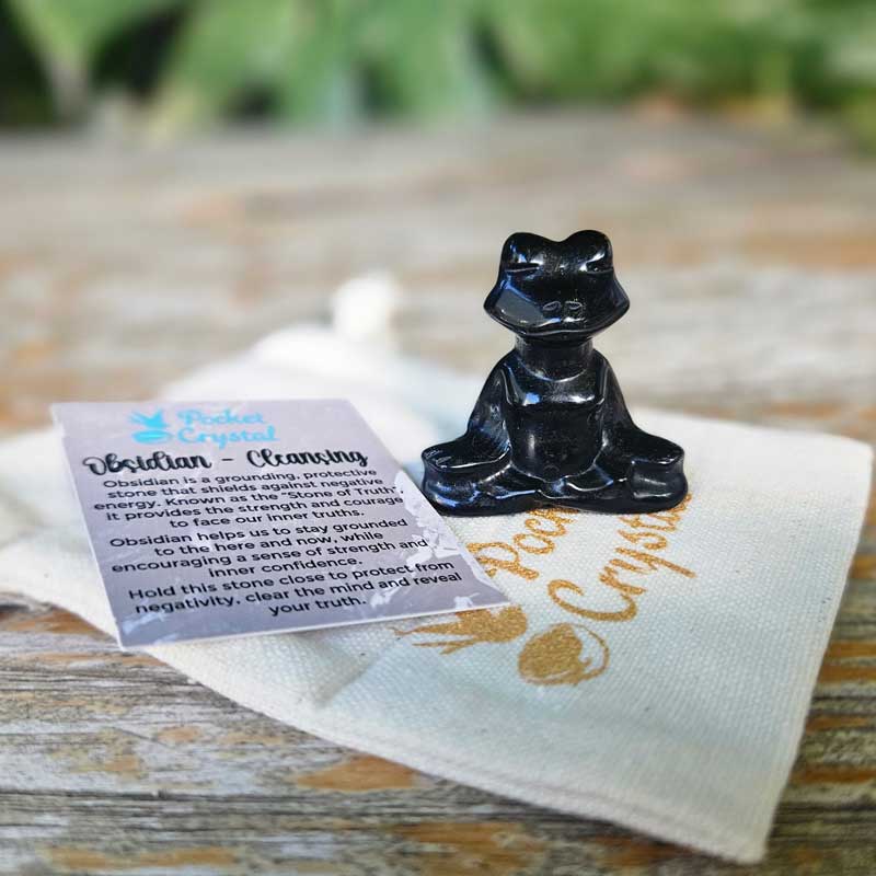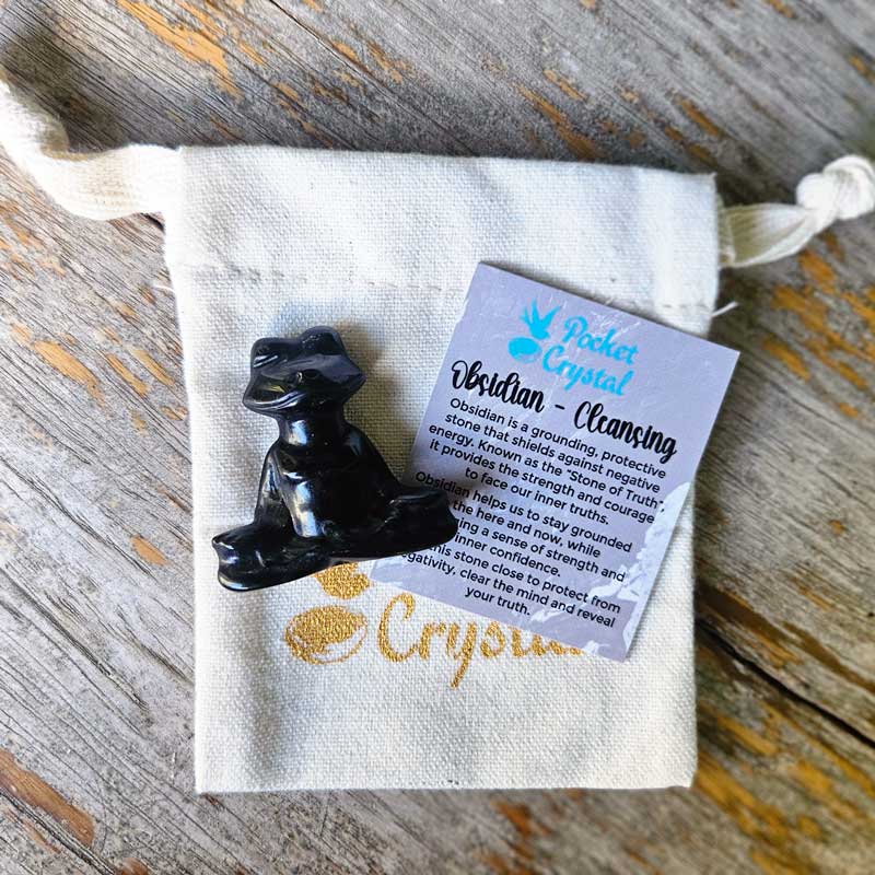 • Includes obsidian yoga frog crystal, card with crystal properties and meaning and fabric drawstring bag.