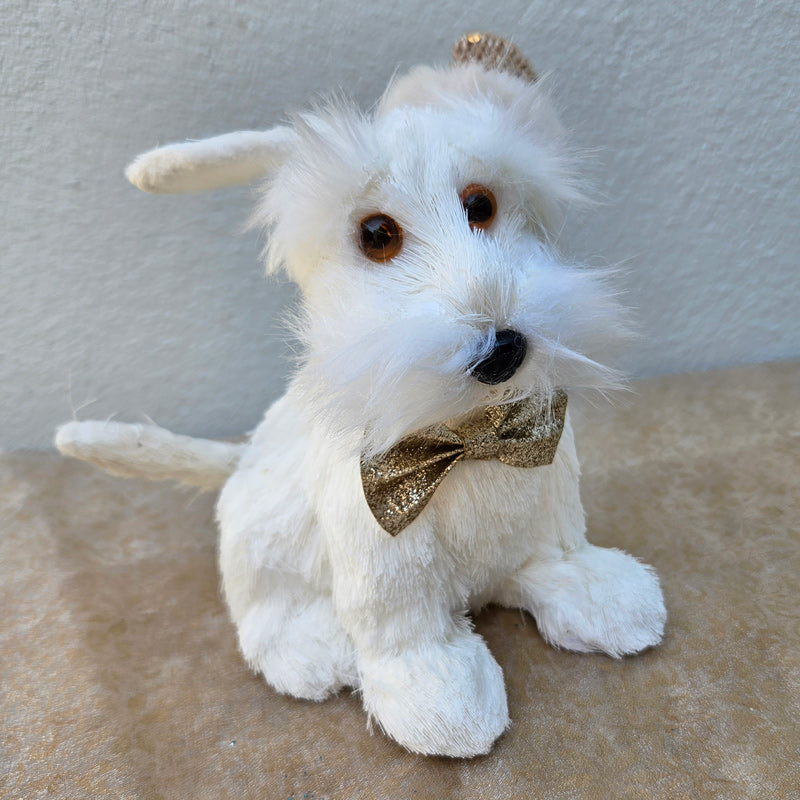 A super cute fluffy sitting Schnauzer with a sparkly gold bow and hat. A must for Schnauzer lovers!