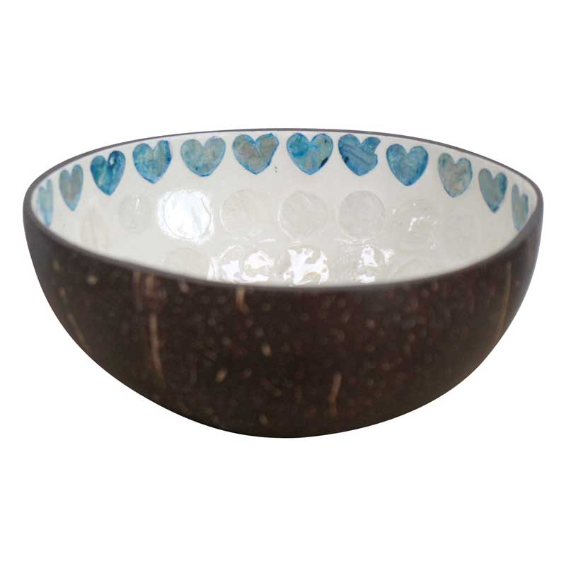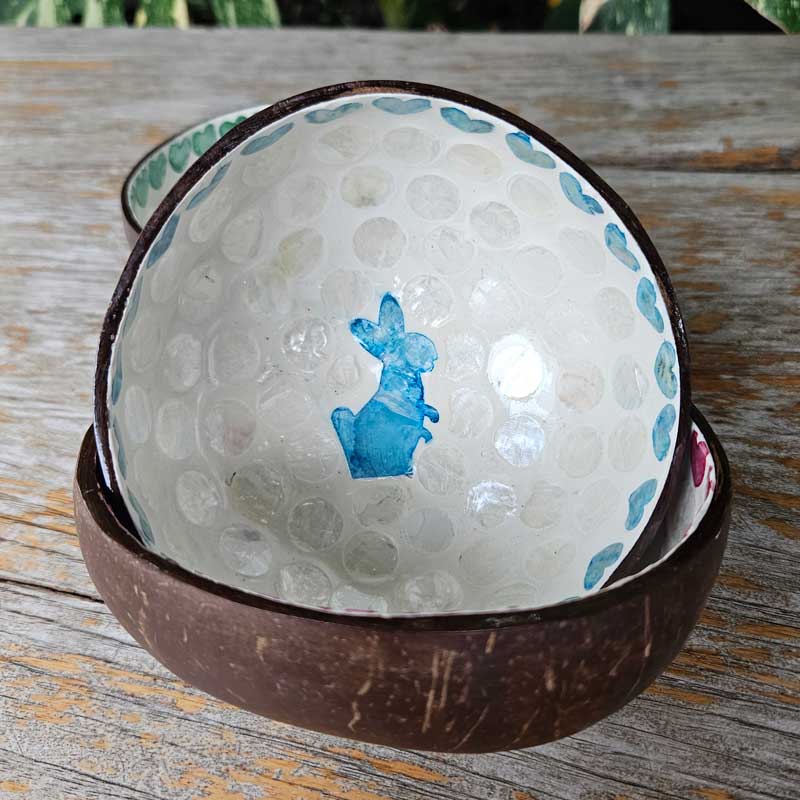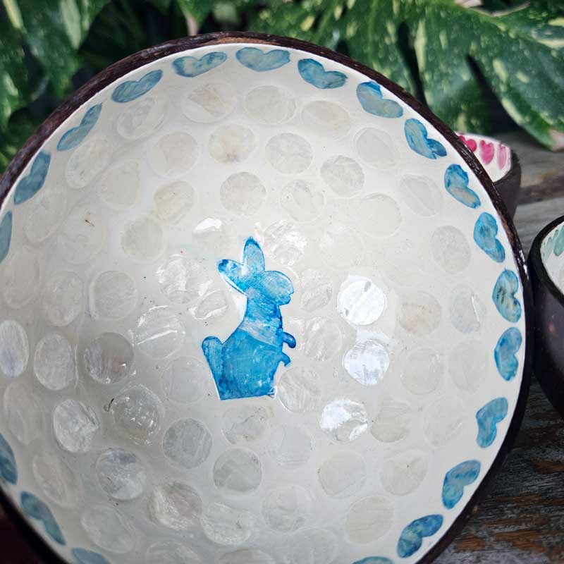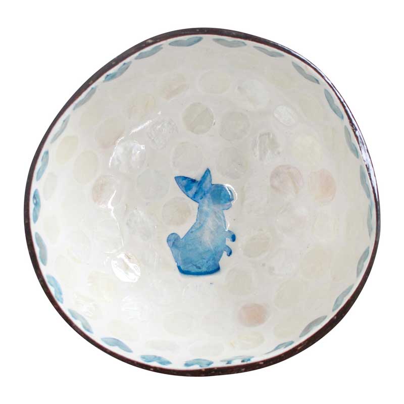 Capture the essence of eco-friendly elegance with this Coconut Bowl - Rabbit Blue. Crafted from natural coconut with dimensions of 13 x 6cm, this bowl has a delightful inner rim adorned with blue hearts and a central rabbit motif.