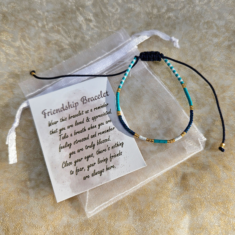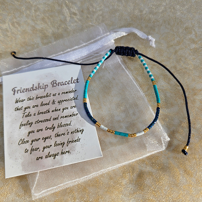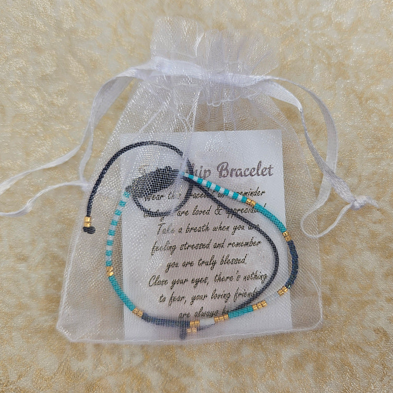 The words on the included affirmation card are: "Wear this bracelet as a reminder that you are loved and appreciated. Take a breath when you are feeling stressed and remember you are truly blessed. Close your eyes there's nothing to fear, your loving friends are always here".