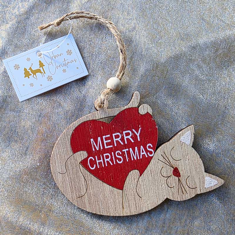 A super cute Christmas hanging ornament featuring a cat holding a red heart with the words Merry Christmas.