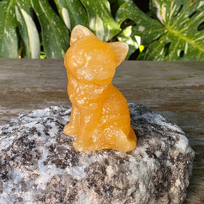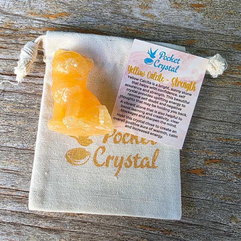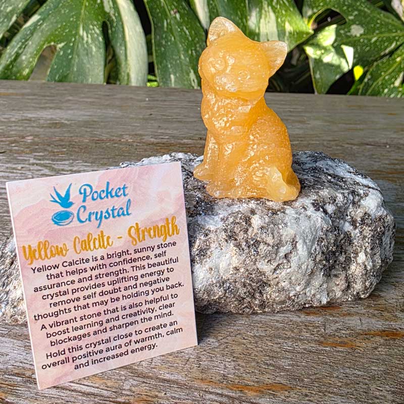 - Includes yellow calcite cat crystal, card with crystal properties and meaning and fabric drawstring bag.