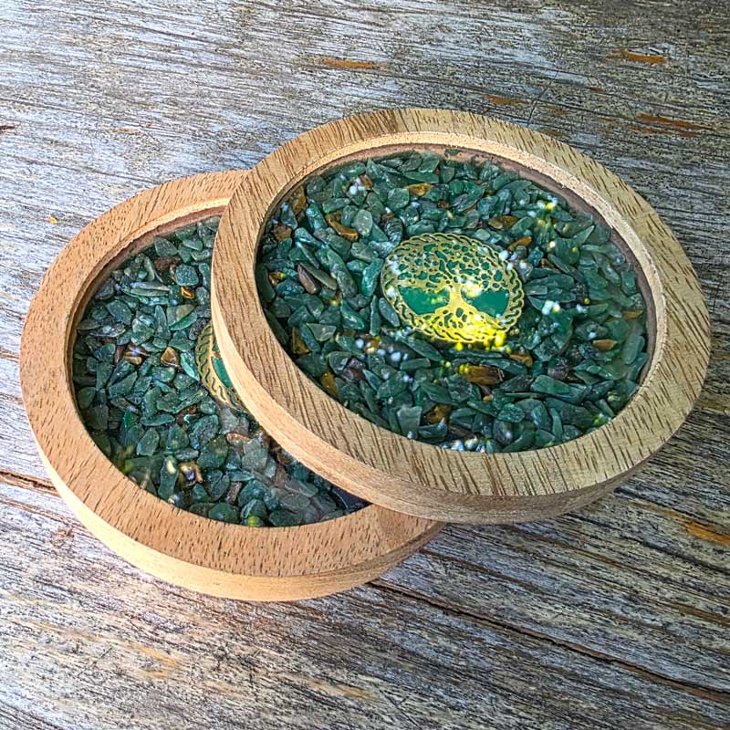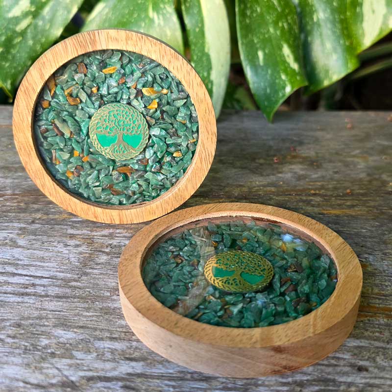 This beautiful coaster set features inlaid aventurine and tiger eye stones, with a Tree of Life symbol in the centre. Includes two coasters in each set.