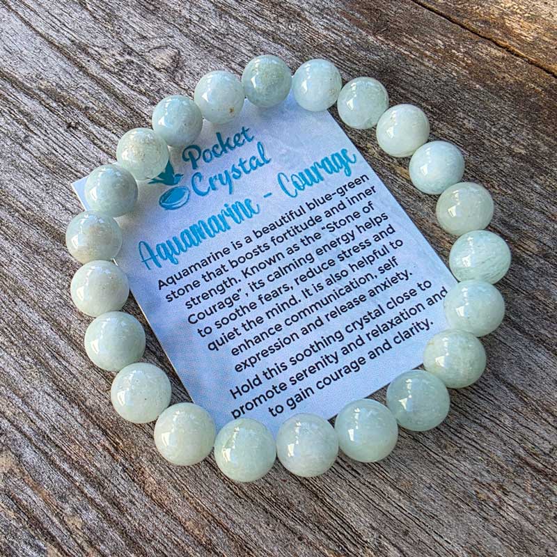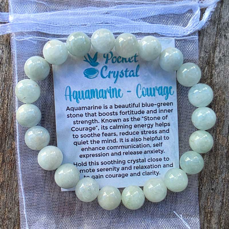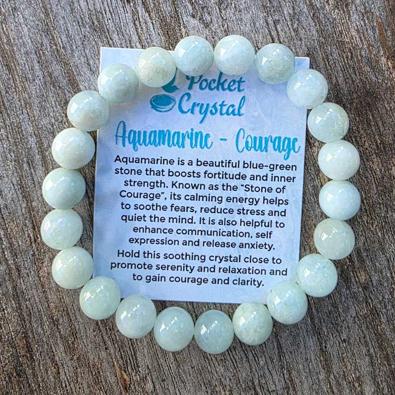 Aquamarine is a beautiful blue-green stone that boosts fortitude and inner strength. Known as the "Stone of Courage", its calming energy helps to soothe fears, reduce stress and quiet the mind. It is also helpful to enhance communication, self expression and release anxiety. Hold this soothing crystal close to promote serenity and relaxation and to gain courage and clarity.