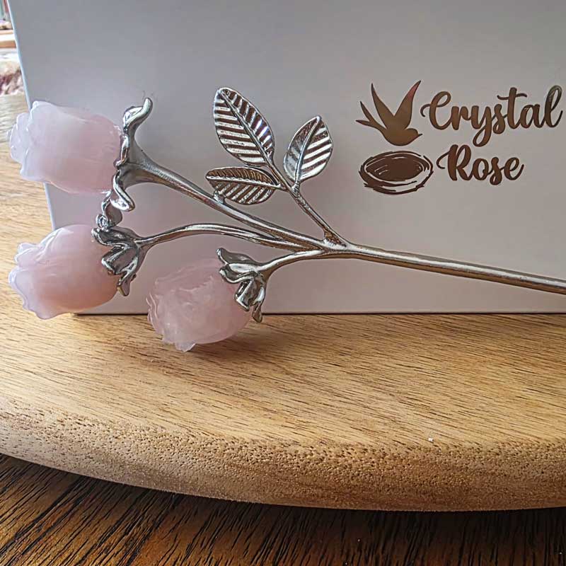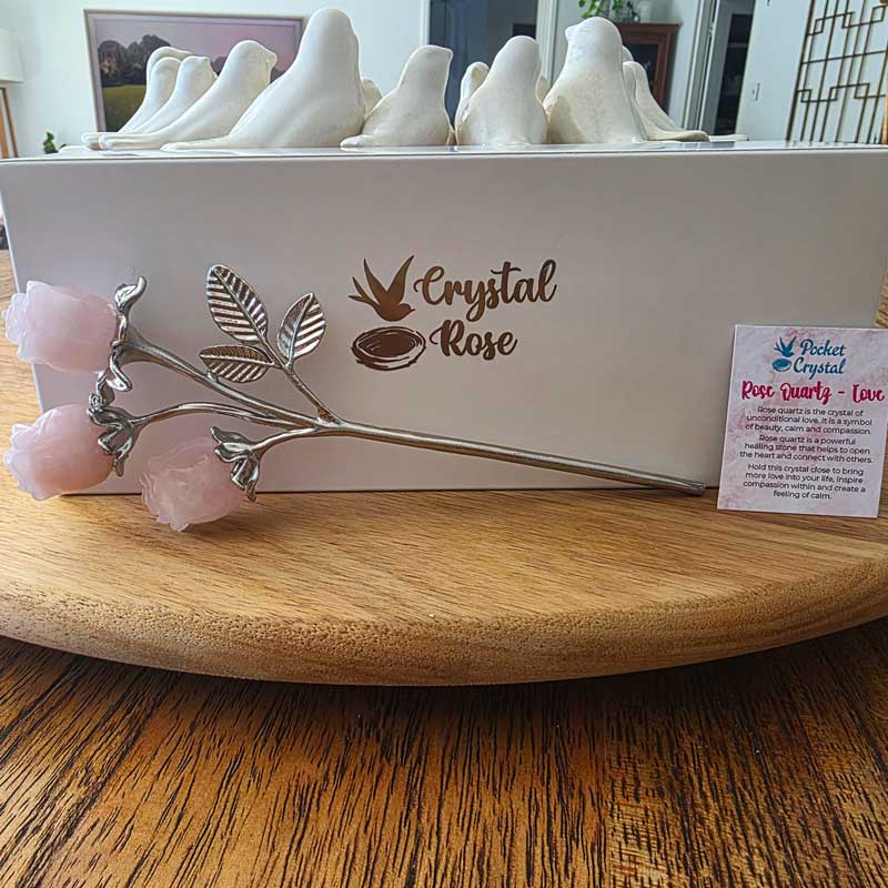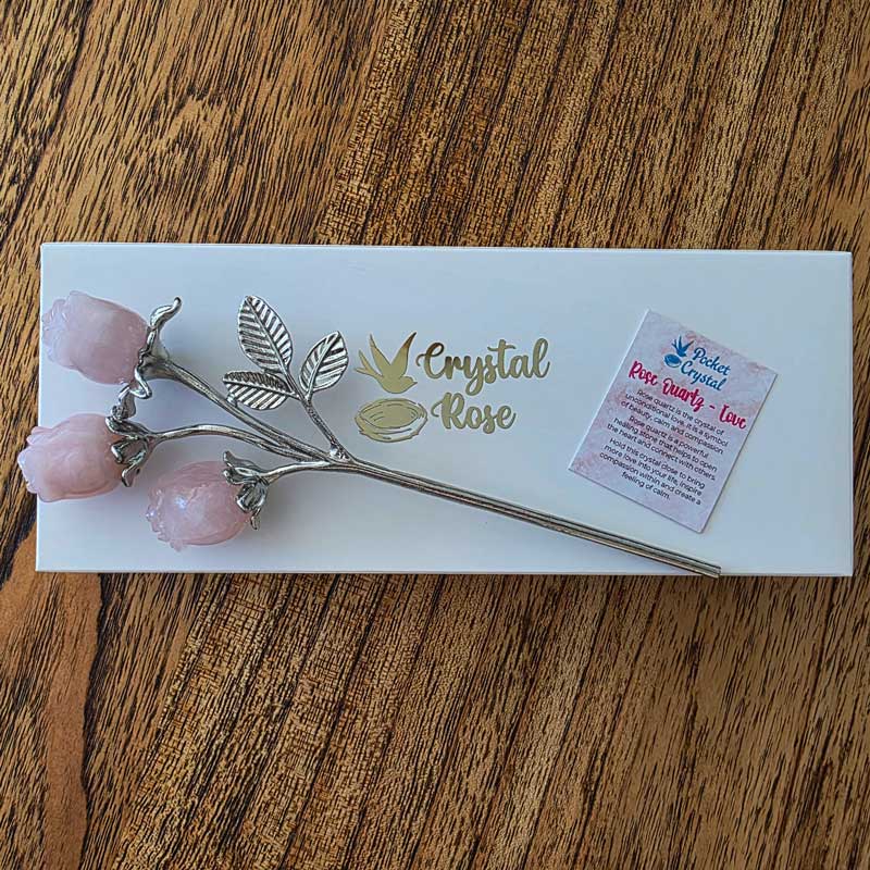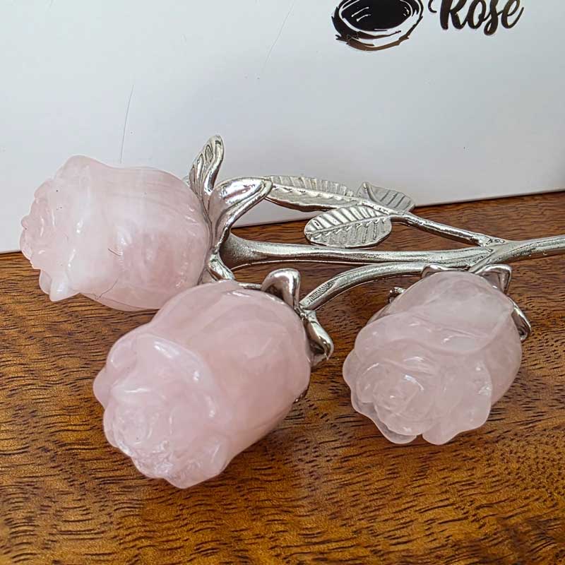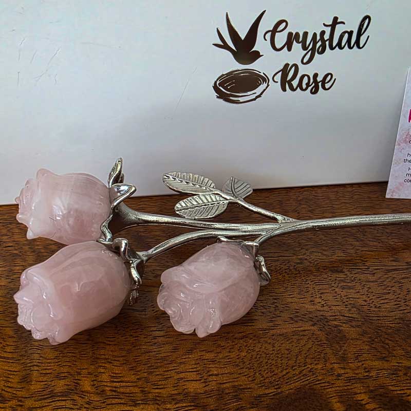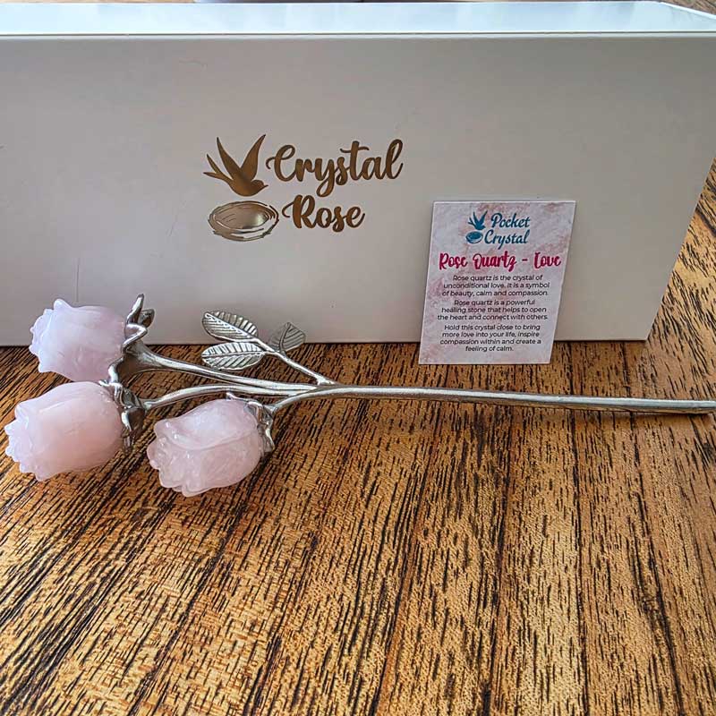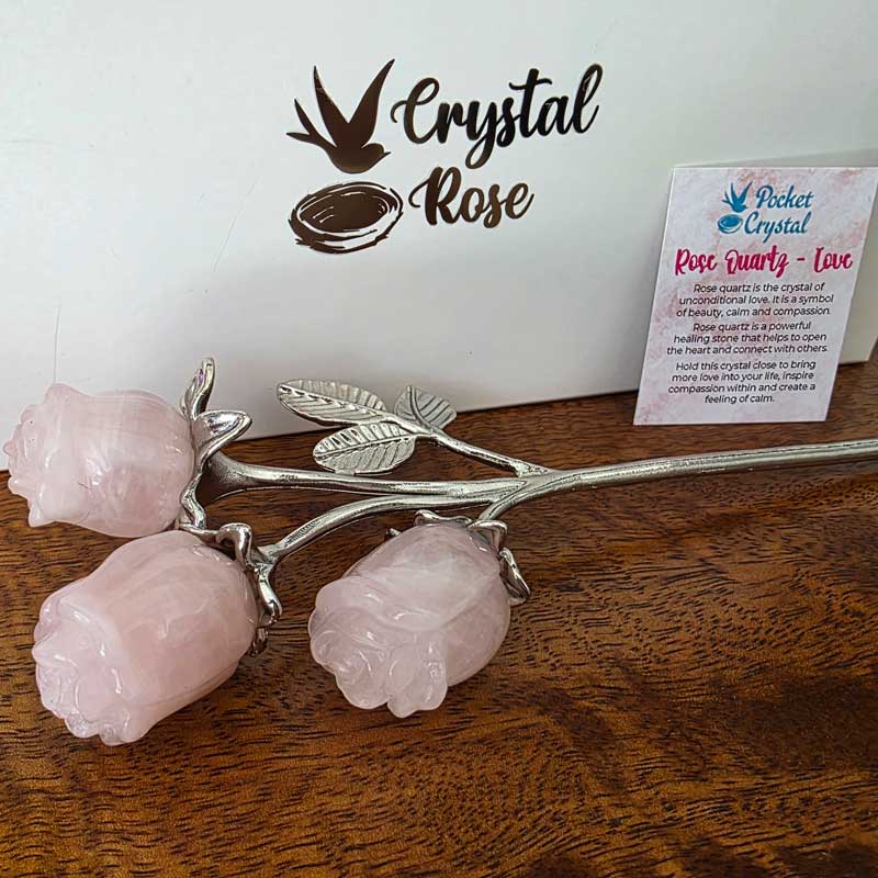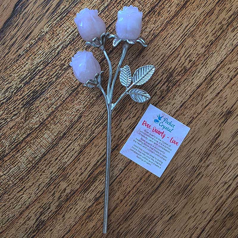 - Includes Rose Quartz triple bud rose crystal bouquet and card with crystal properties and meaning