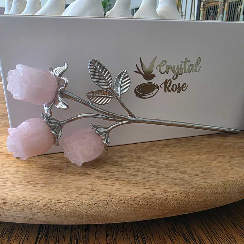 Includes a triple bud crystal & metal rose bouquet and a card with the crystal's unique meaning and properties.