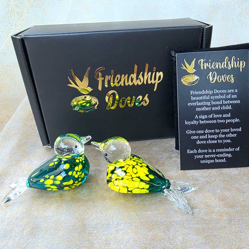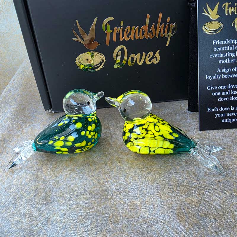 - Includes 2 x glass handmade friendship doves in gift box nest, 2 x affirmation cards & pouch for 2nd dove