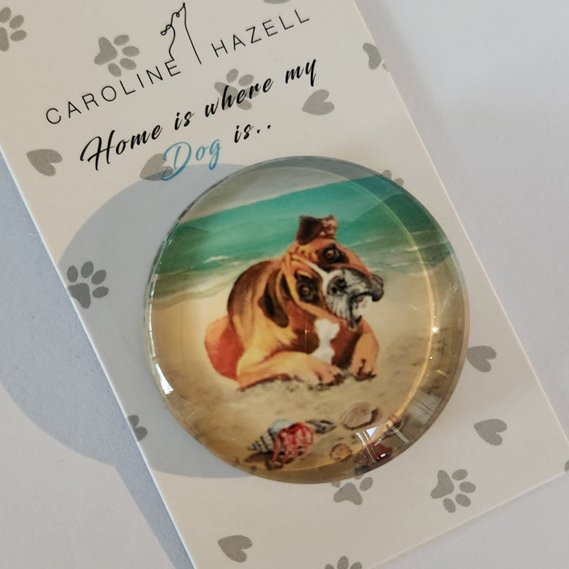 This is the perfect gift for your dog loving friends! A cute glass button magnet that comes on a gift card. Features a beautiful boxer beach dog design.