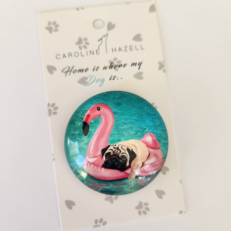 This is the perfect gift for your dog loving friends! A cute glass button magnet that comes on a gift card. Features a beautiful pug beach dog design.