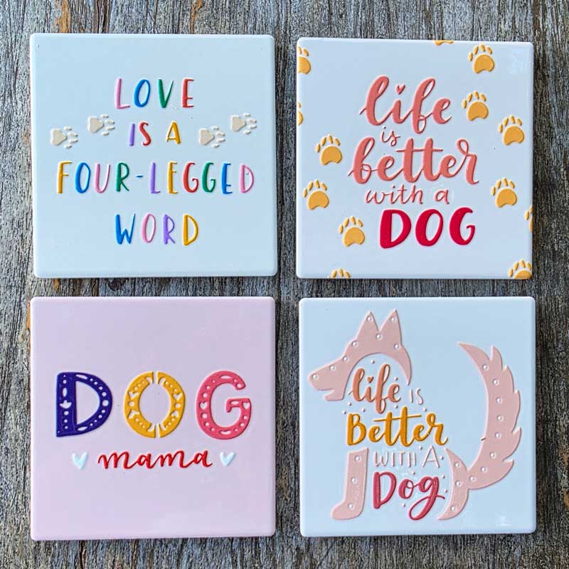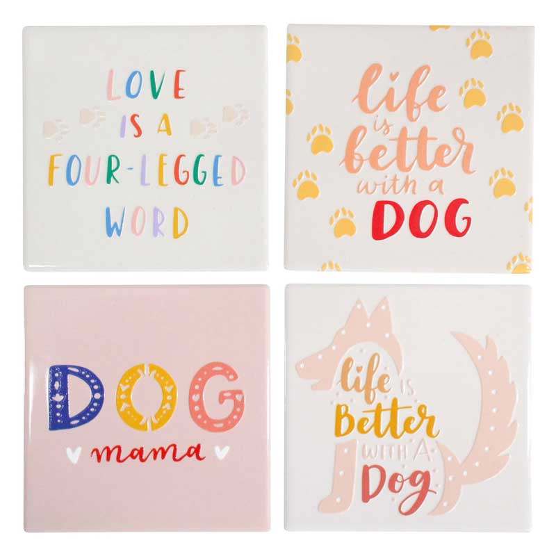 Dog lovers will go mad for this dog sayings ceramic coaster set! This coaster set features four dog sayings, perfect for a dog person. Includes four coasters in each set.