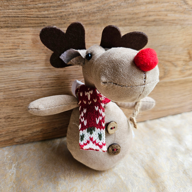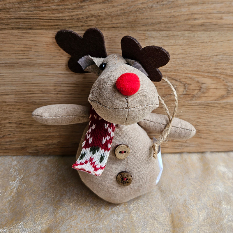 A cute hanging Christmas reindeer with a lovely knit scarf.