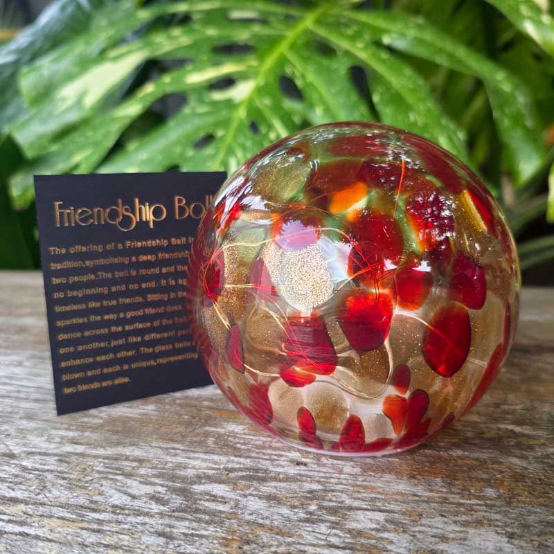 "The offering of a Friendship Ball is an old tradition symbolising a deep friendship between two people. The ball is round and therefore has no beginning and no end. It is ageless and timeless like true friends. Sitting in the sunlight, it sparkles the way a good friend does. The colours dance across the surface of the ball enhancing one another just like different personalities enhance each other. The glass balls are hand blown and each is unique representing how no two friends are alike."