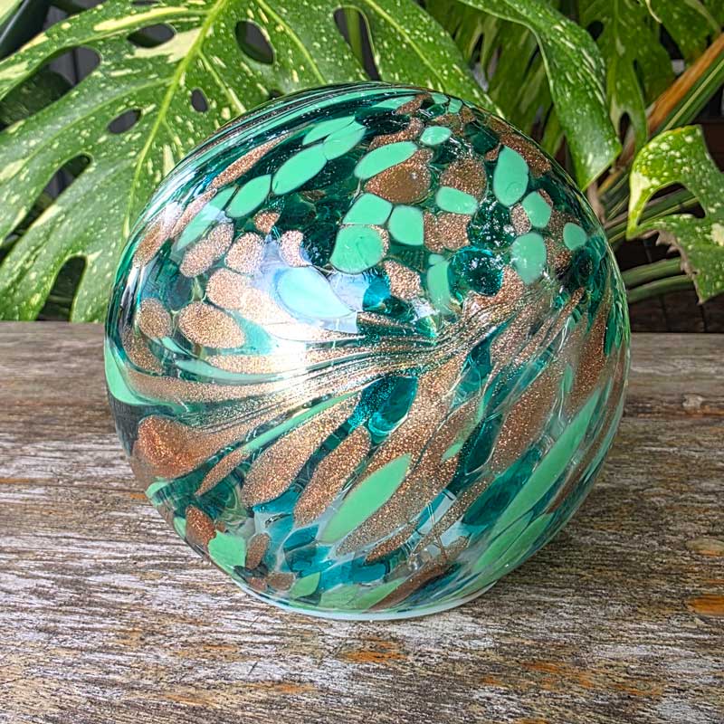 Features a stunning rippled swirl pattern in a mix of teal green and gold.