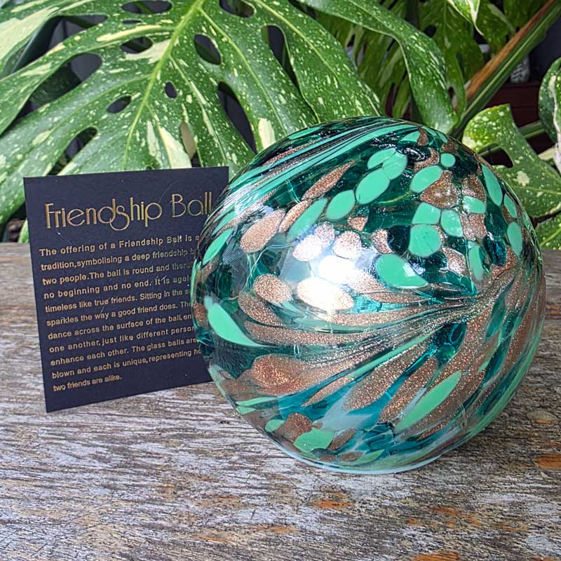 "The offering of a Friendship Ball is an old tradition symbolising a deep friendship between two people. The ball is round and therefore has no beginning and no end. It is ageless and timeless like true friends. Sitting in the sunlight, it sparkles the way a good friend does. The colours dance across the surface of the ball enhancing one another just like different personalities enhance each other. The glass balls are hand blown and each is unique representing how no two friends are alike."