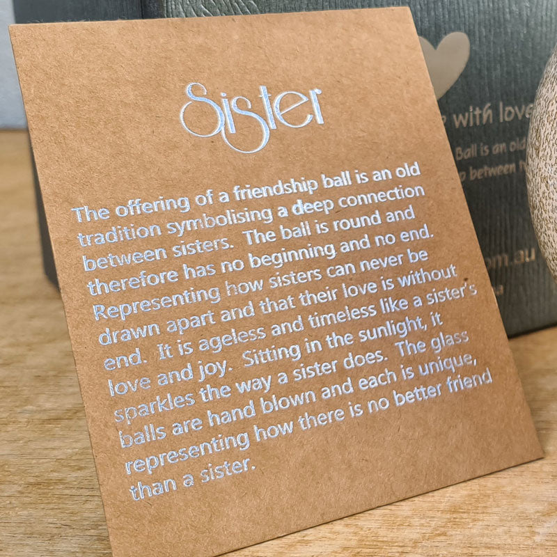 "The offering of a Friendship Ball is an old tradition symbolising a deep connection between sisters. The ball is round and therefore has no beginning and no end. Representing how sisters can never be drawn apart and that their love is without end. It is ageless and timeless like a sister’s love and joy. Sitting in the sunlight, it sparkles the way a sister does. The glass balls are hand blown and each is unique representing how there is no better friend than a sister."