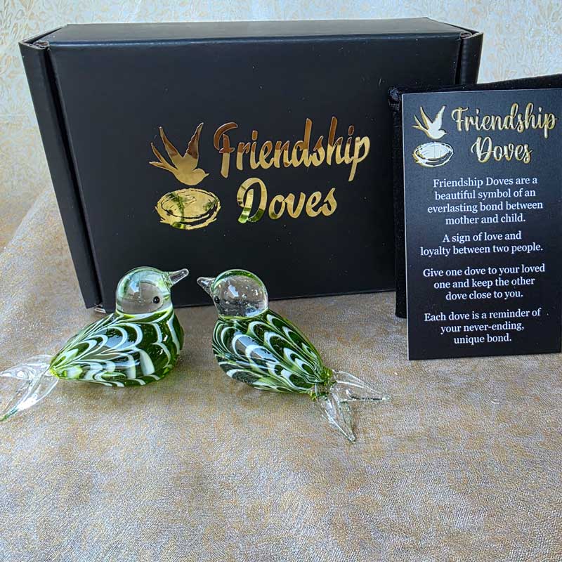 - Includes 2 x glass handmade friendship doves in gift box nest, 2 x affirmation cards & pouch for 2nd dove