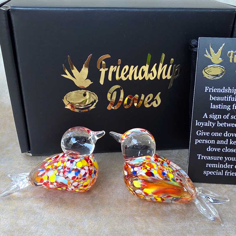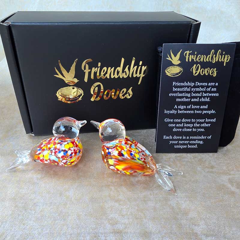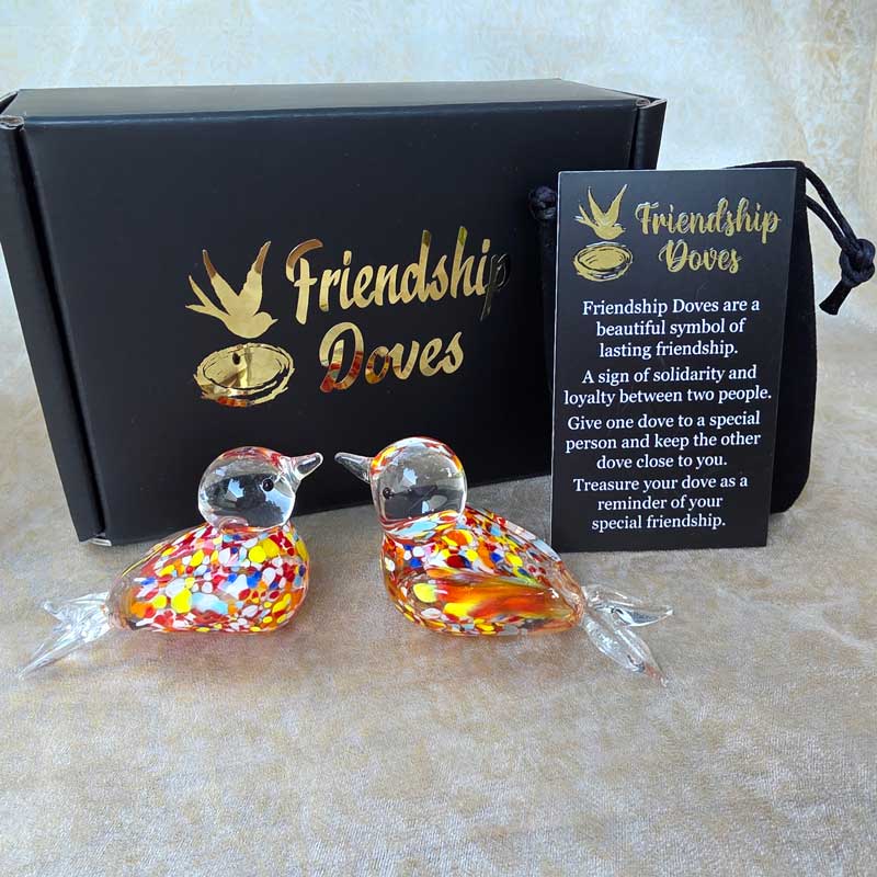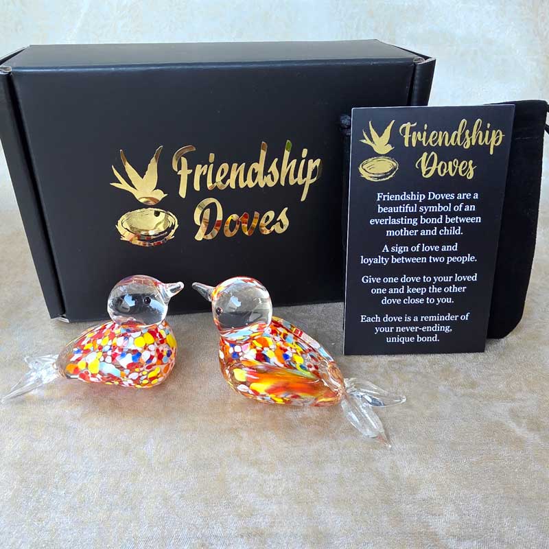 - Includes 2 x glass handmade friendship doves in gift box nest, 2 x affirmation cards & pouch for 2nd dove