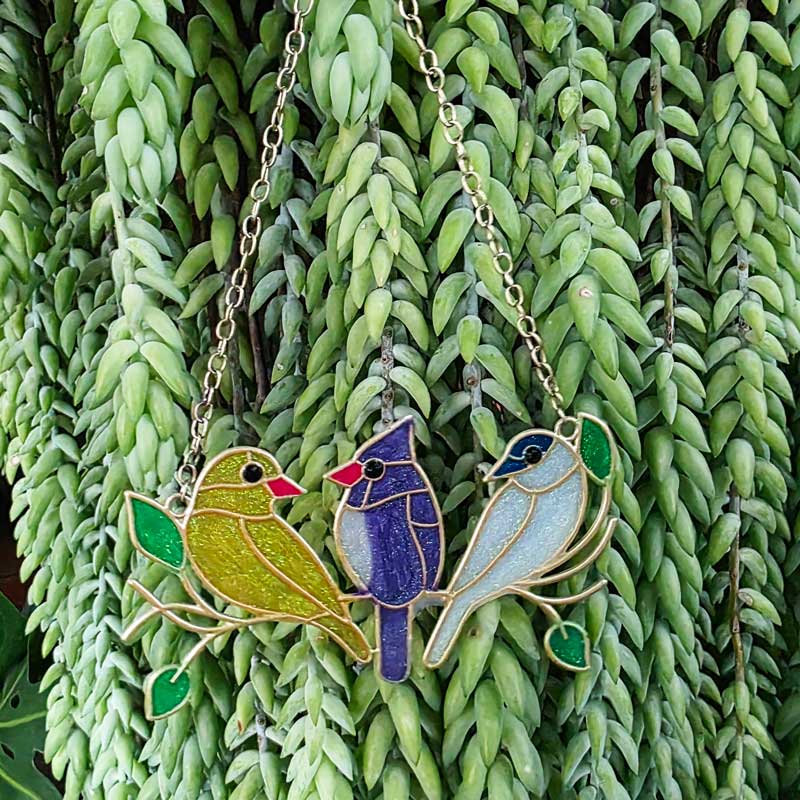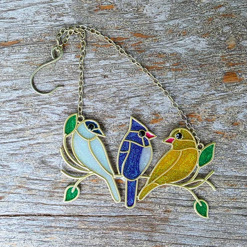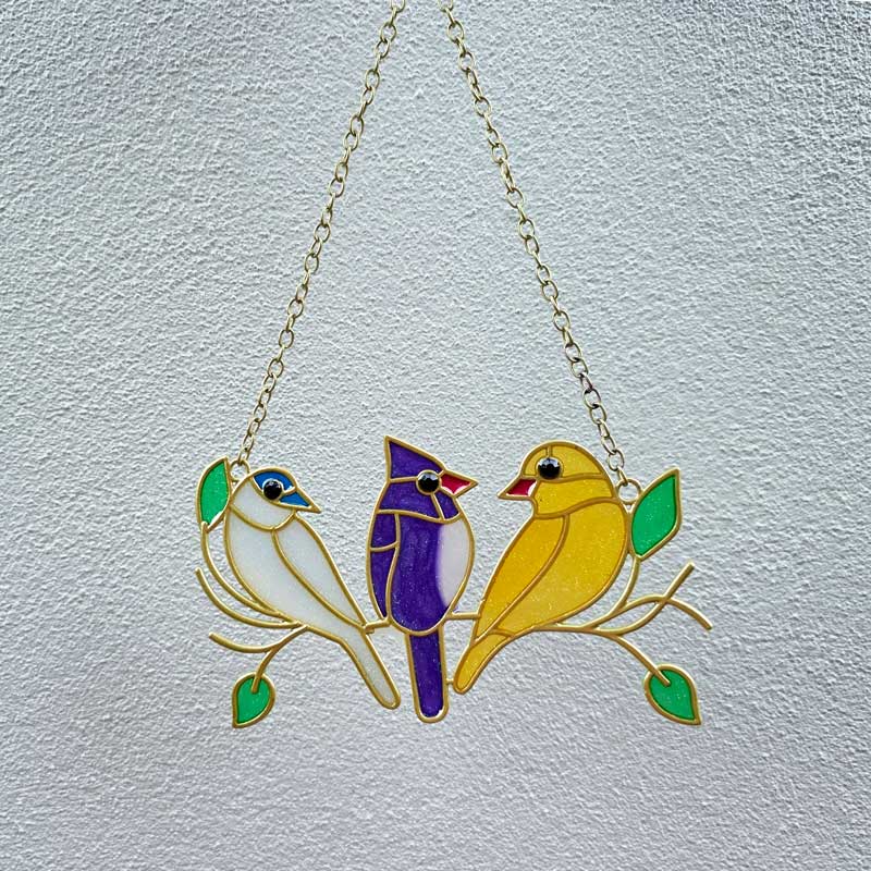 A lovely hanging suncatcher ornament crafted from glass and metal. Features three birds perched on a branch with beautiful colours that will brighten your day as the light catches it. Hang it in your garden or near a window to catch the sunlight through the coloured glass.