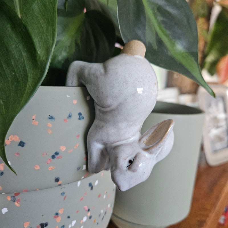 A cute rabbit figurine that sits at the top of your pot plant., branch, vase or trellis. Adds a decorative touch to liven up your garden. The perfect little gift for any plant or animal lover or a treat for yourself.