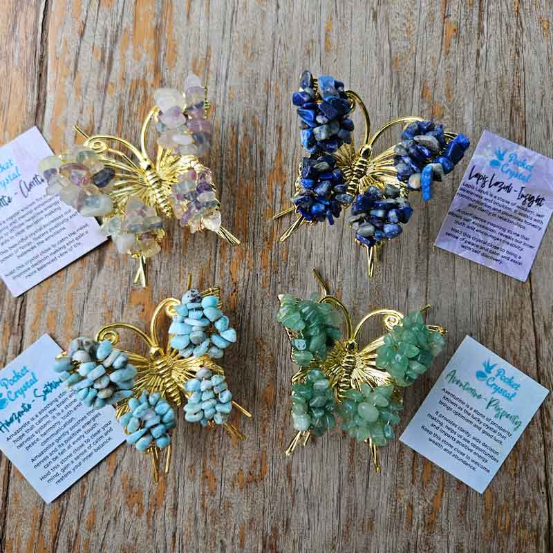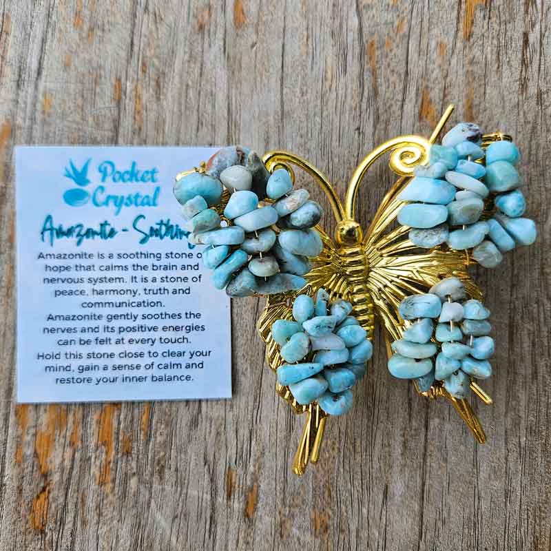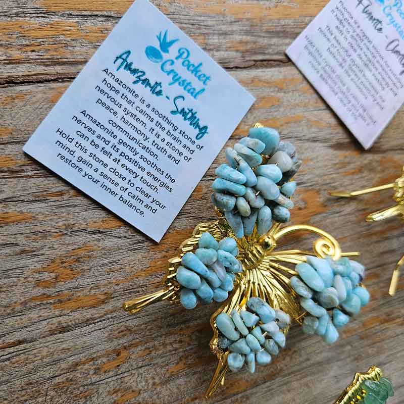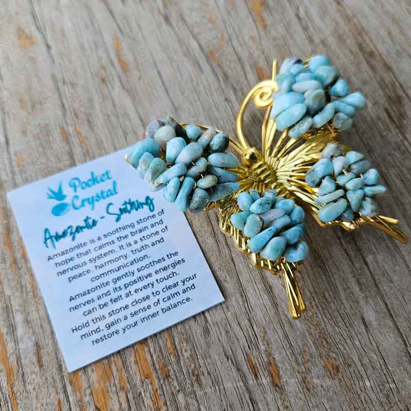 - Includes amazonite crystal & metal butterfly, card with crystal properties and meaning and fabric drawstring bag.