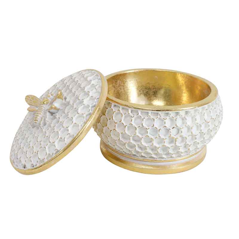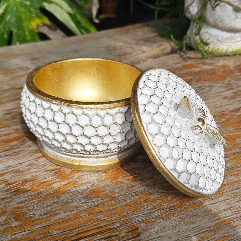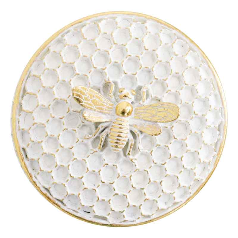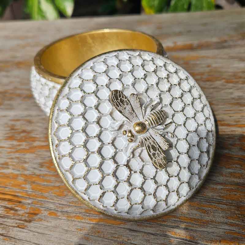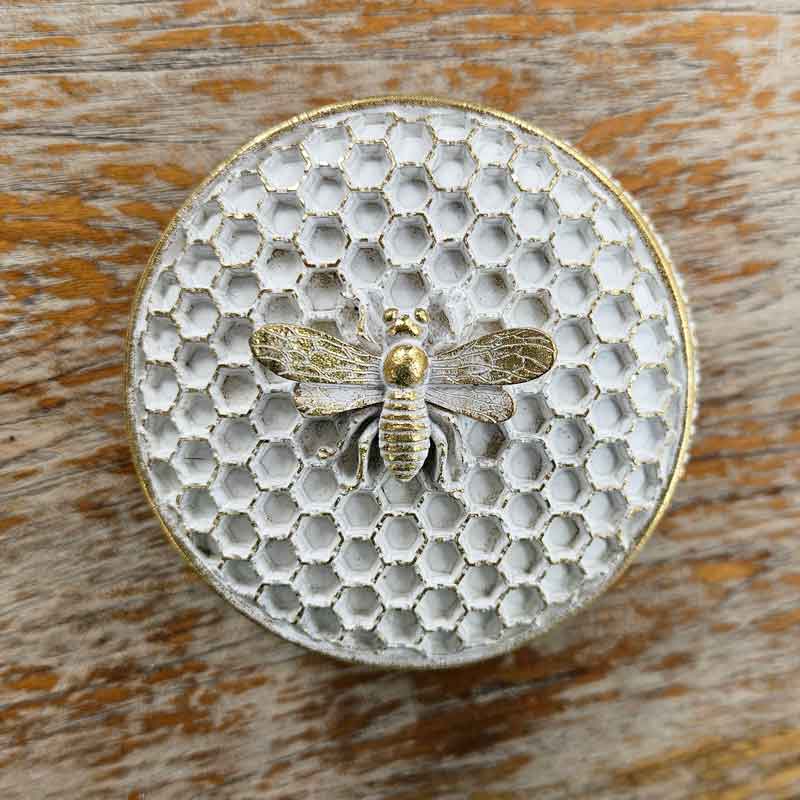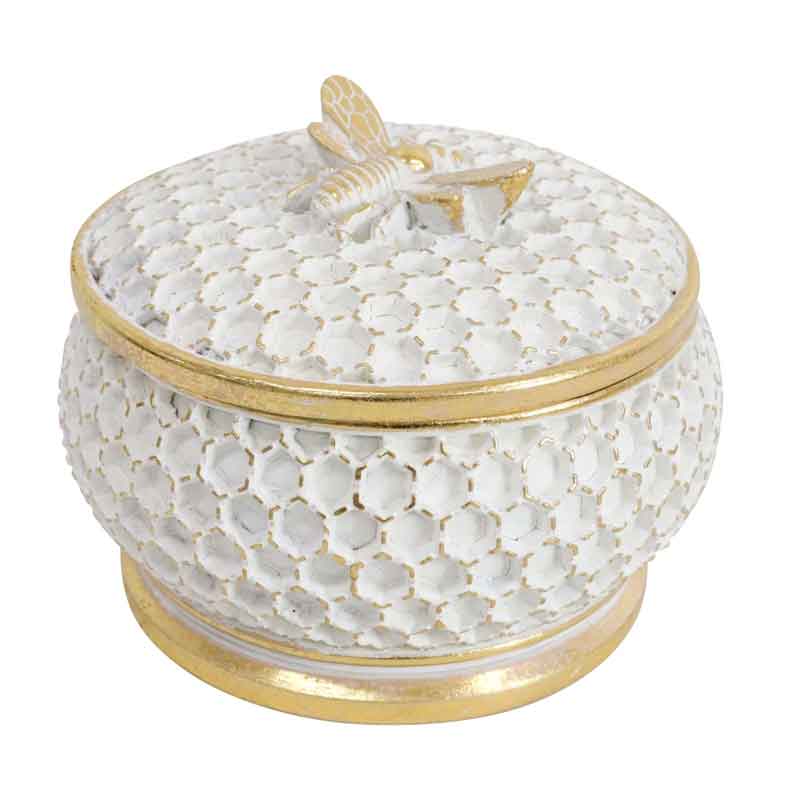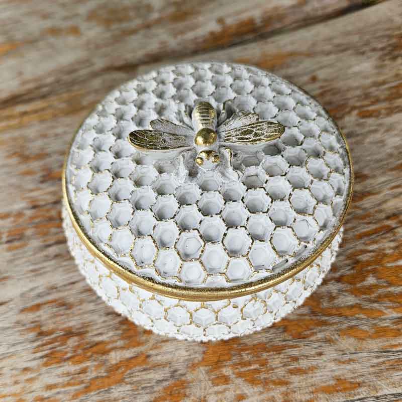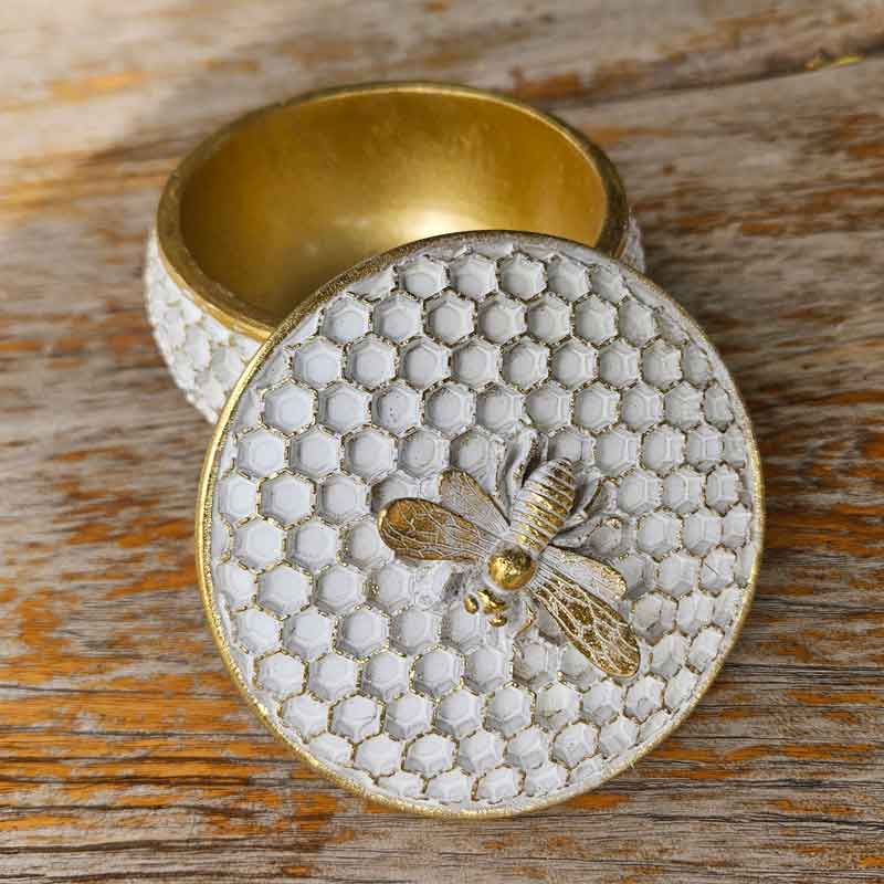 This pretty trinket bowl, featuring a bee design, will look perfect on a dresser or bathroom vanity, holding your rings, hair ties or other bits and pieces. Crafted from high-quality resin, this elegant white container features intricate honeycomb detailing and a charming bee accent. Perfect for holding small treasures or simply used as an attractive display piece on a coffee table or side table.