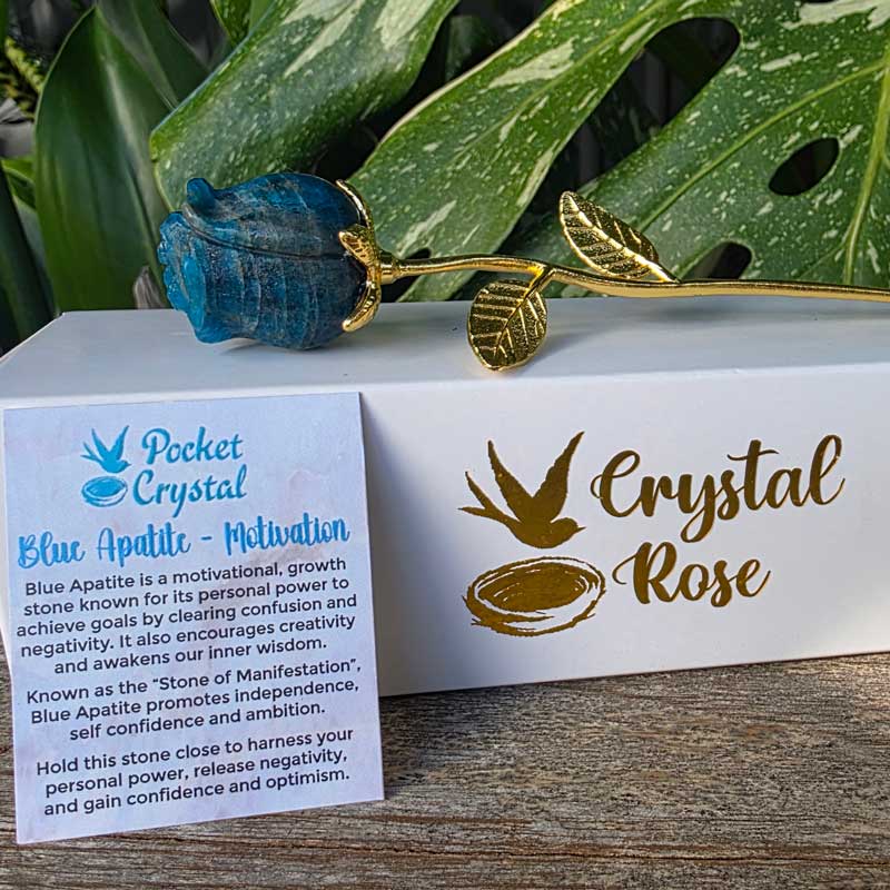 - Includes Blue Apatite rose crystal and card with crystal properties and meaning