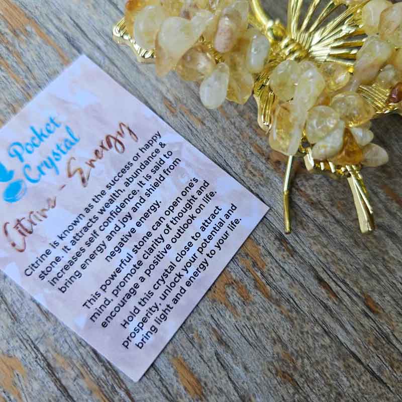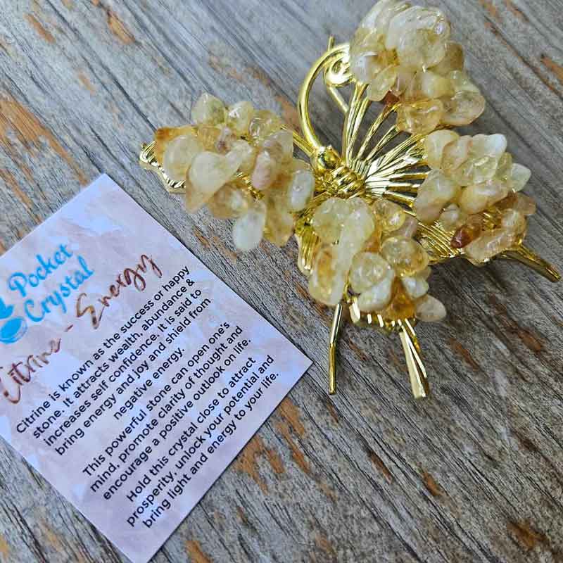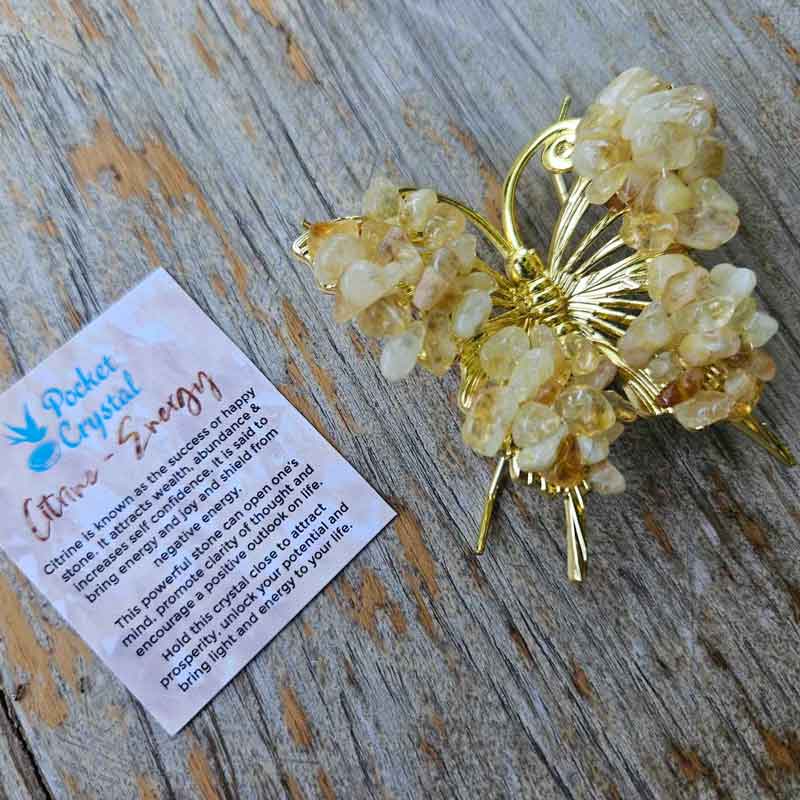 - Includes citrine crystal & metal butterfly, card with crystal properties and meaning and fabric drawstring bag.
