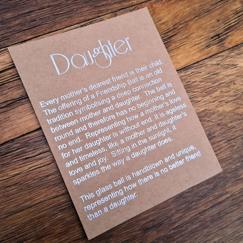 Show your daughter how much she means to you with the unique gift of a Daughter Friendship Ball! This stunning Daughter Friendship Ball has been hand made and mouth blown to create a one of a kind piece, perfect for your one of a kind daughter!