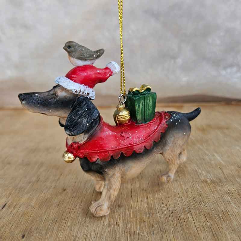 A cute hanging dog Christmas ornament, a must for Dachshund people! Made with careful detail with a cute little bird perched atop its head.