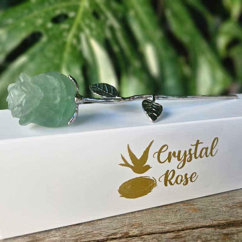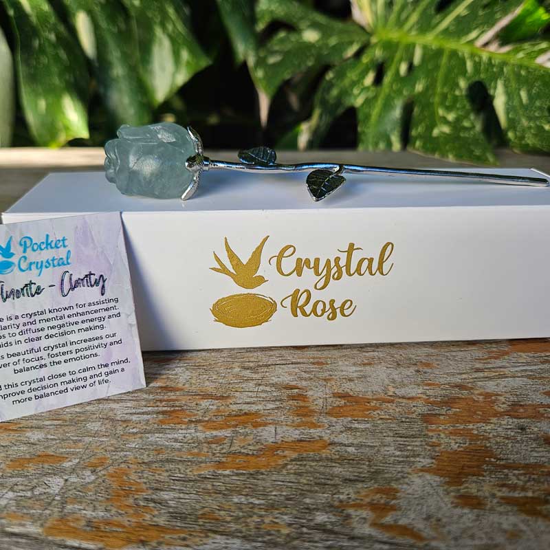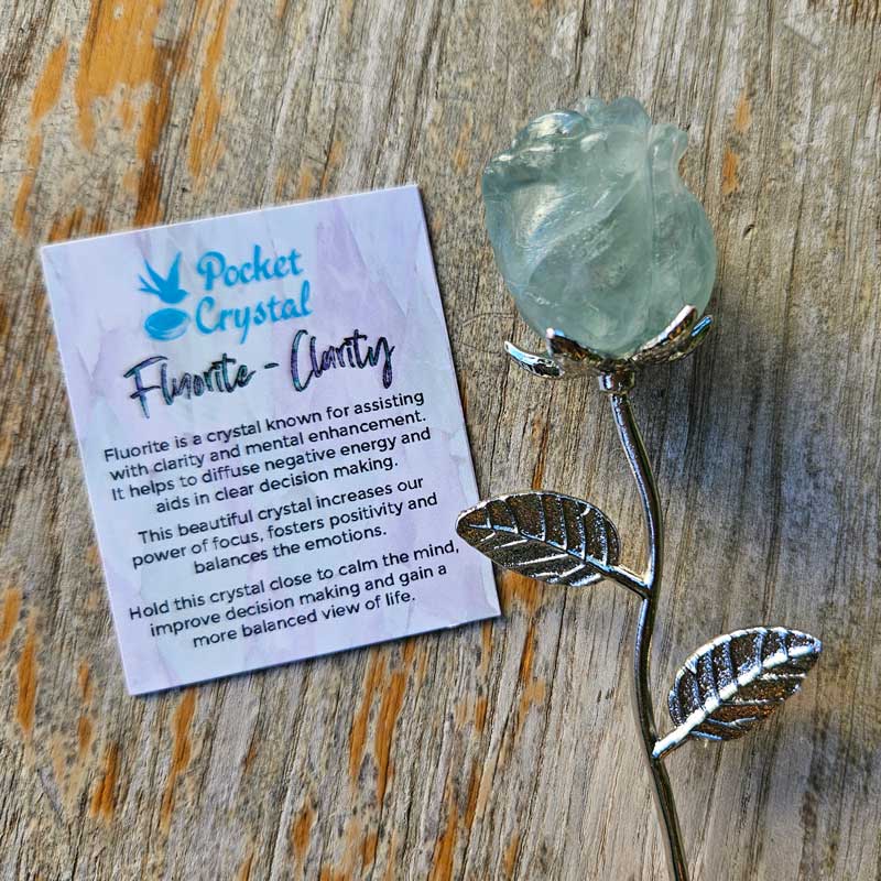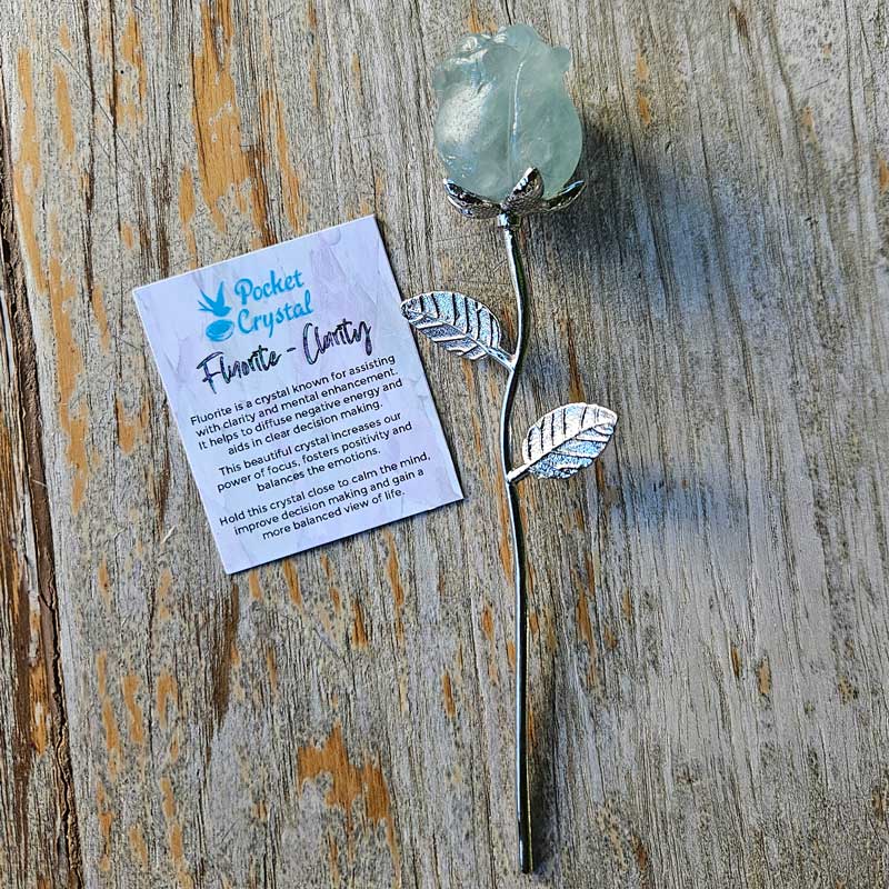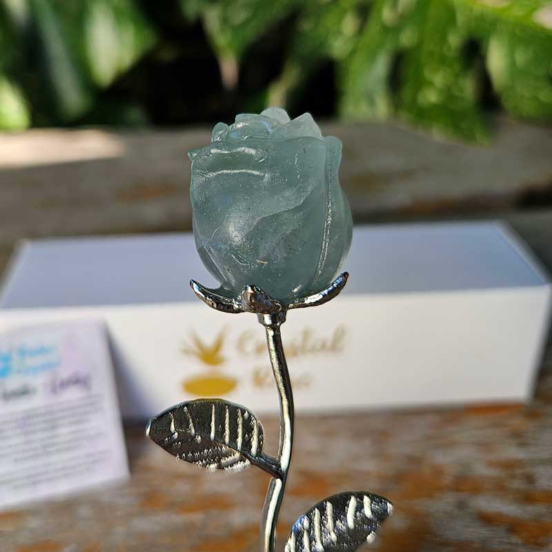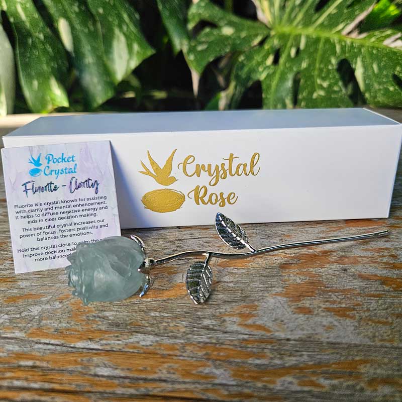 Includes a crystal & metal rose and a card with the crystal's unique meaning and properties.
