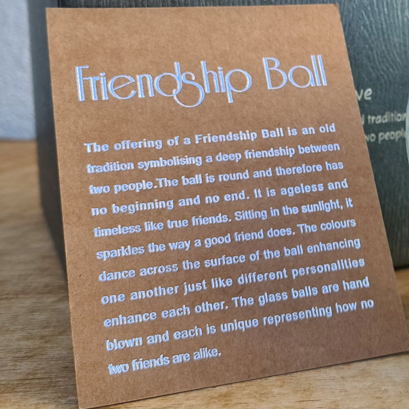"The offering of a Friendship Ball is an old tradition symbolising a deep friendship between two people. The ball is round and therefore has no beginning and no end. It is ageless and timeless like true friends. Sitting in the sunlight, it sparkles the way a good friend does. The colours dance across the surface of the ball enhancing one another just like different personalities enhance each other. The glass balls are hand blown and each is unique representing how no two friends are alike."