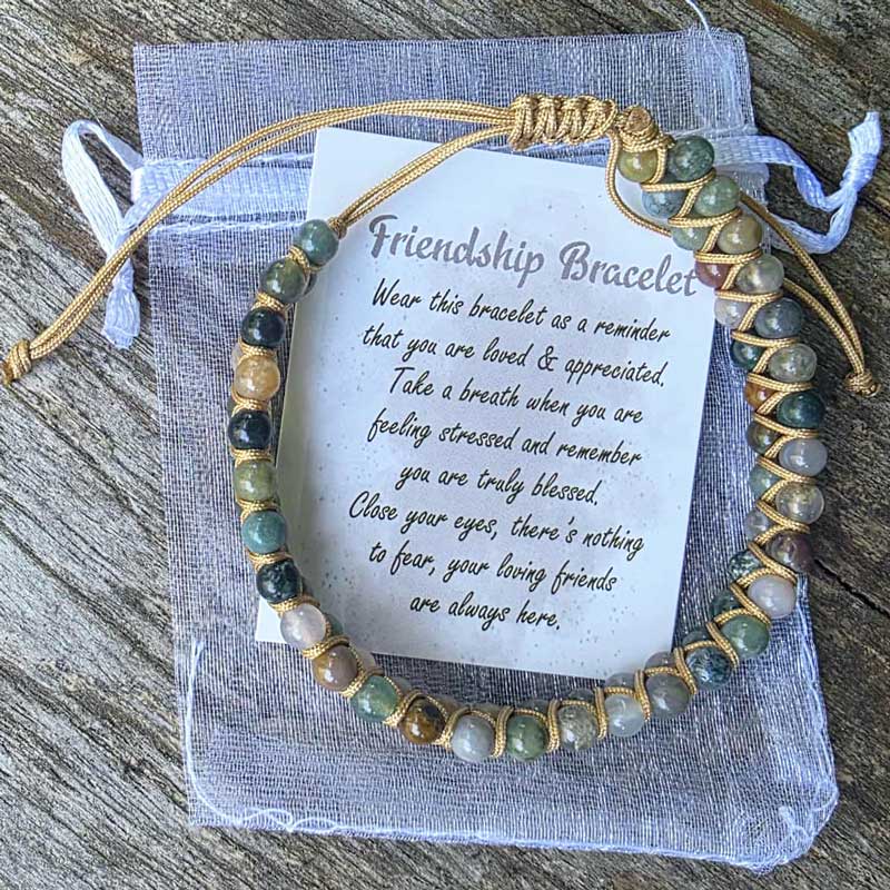 The words on the included affirmation card are: "Wear this bracelet as a reminder that you are loved and appreciated. Take a breath when you are feeling stressed and remember you are truly blessed. Close your eyes there's nothing to fear, your loving friends are always here".