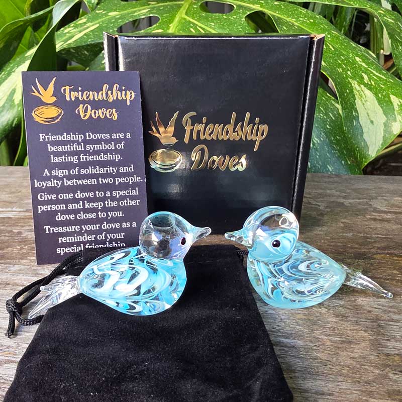 - Includes 2 x glass handmade friendship doves in gift box nest, 2 x affirmation cards & velvet pouch for 2nd dove