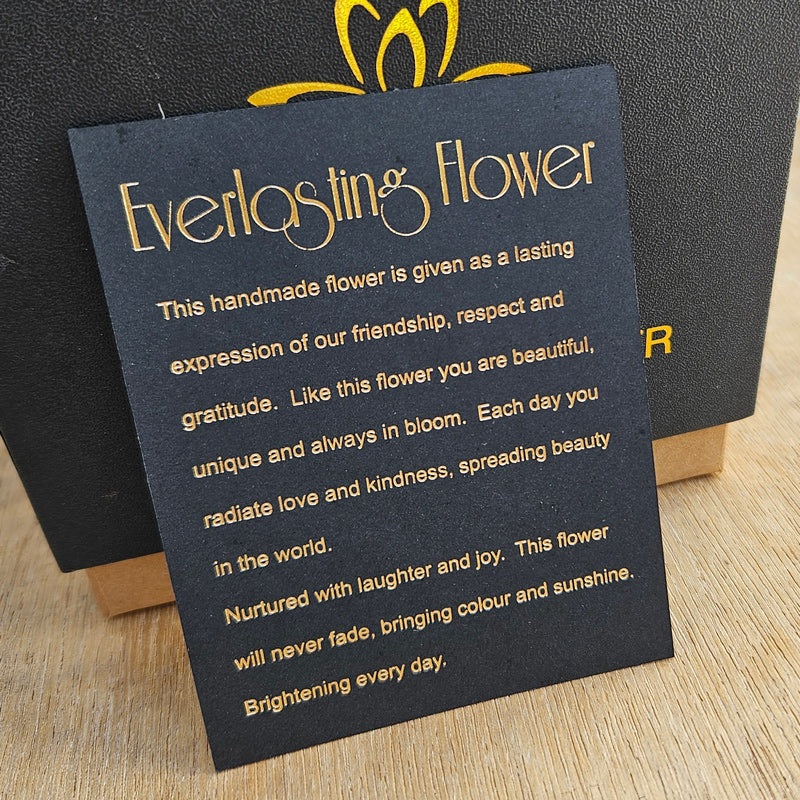 “This handmade flower is given as a lasting expression of our friendship, respect and gratitude. Like this flower you are beautiful, unique and always in bloom. Each day you radiate love and kindness and spread beauty in the world. Nurtured with laughter and joy. This flower will never fade, bringing colour and sunshine. Brightening every day.”