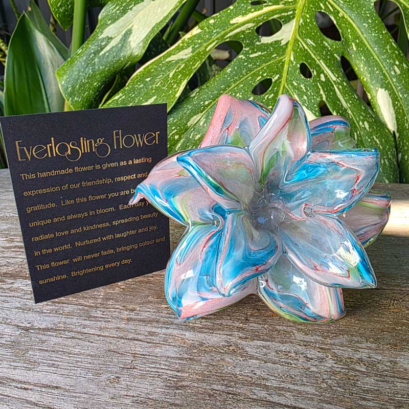 “This handmade flower is given as a lasting expression of our friendship, respect and gratitude. Like this flower you are beautiful, unique and always in bloom. Each day you radiate love and kindness and spread beauty in the world. Nurtured with laughter and joy. This flower will never fade, bringing colour and sunshine. Brightening every day.”