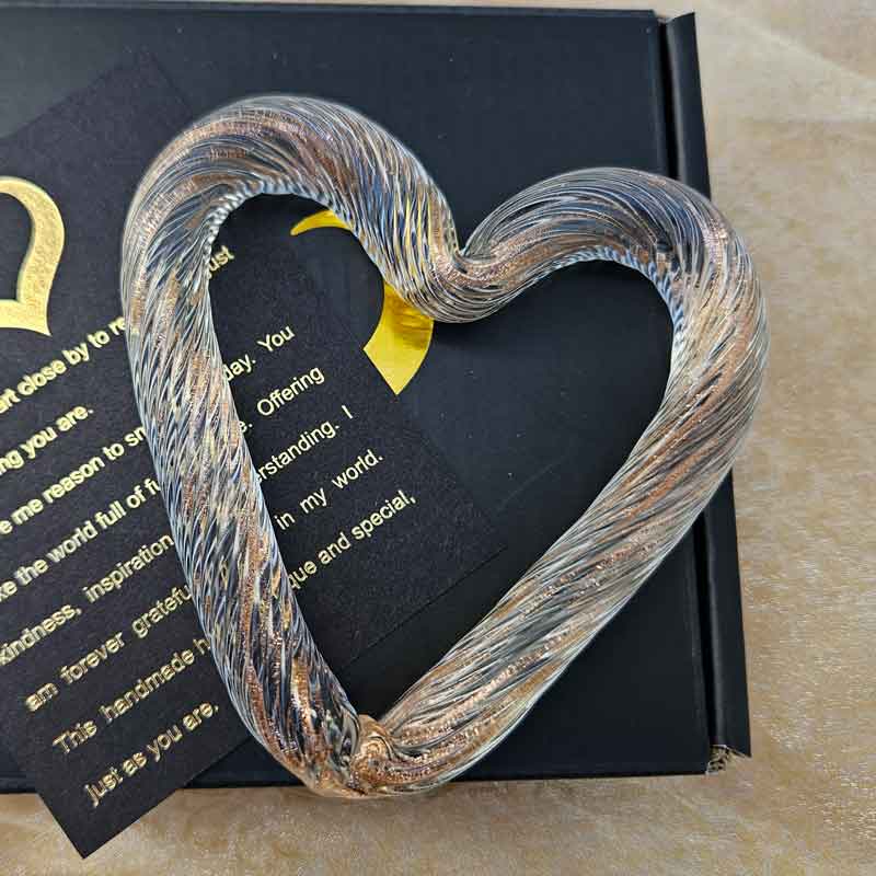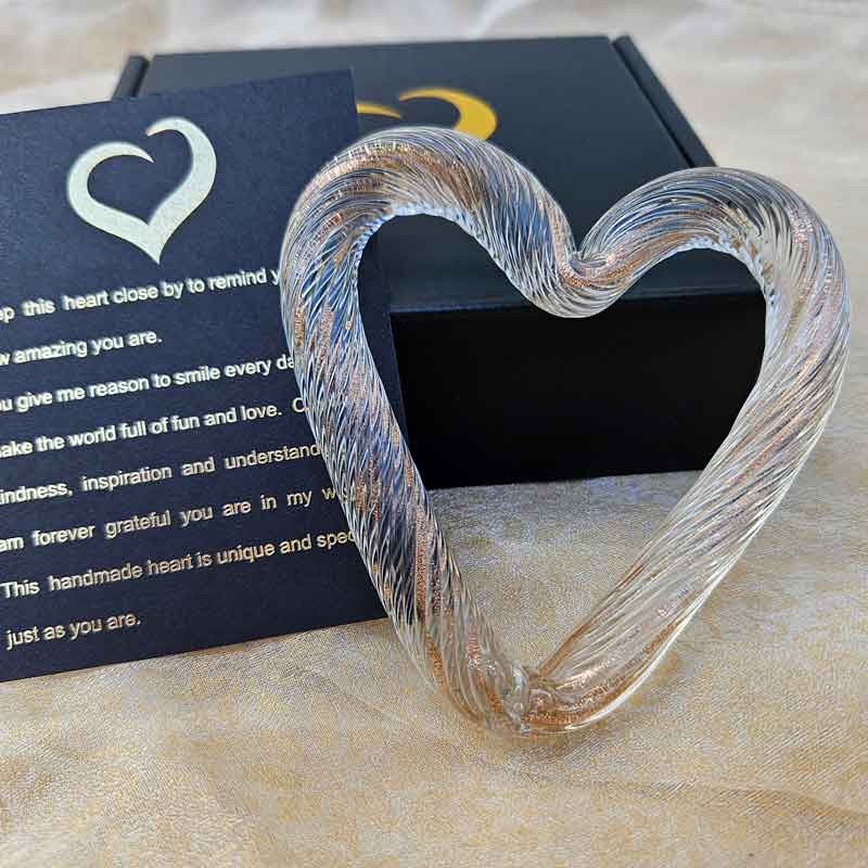 Show someone how much you care with this beautiful handmade glass heart! This stunning heart has been hand made and mouth blown to create a one of a kind piece, perfect for a one of a kind friend, family member, partner or loved one!