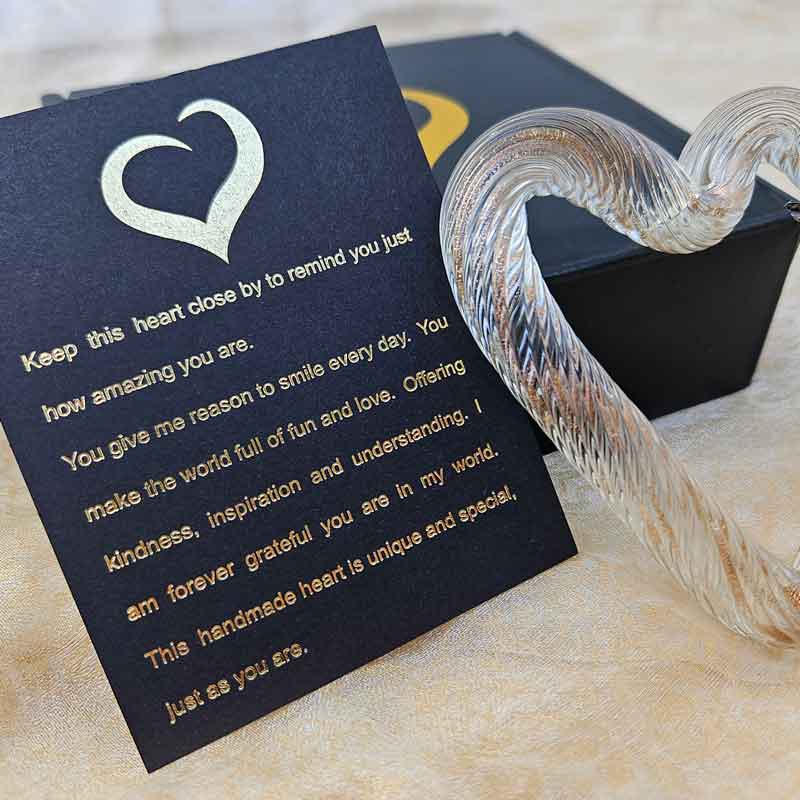 “Keep this heart close by to remind you just how amazing you are. You give me reason to smile every day. You make the world full of fun and love. Offering kindness, inspiration and understanding. I am forever grateful you are in my world. This handmade heart is unique and special, just as you are.”
