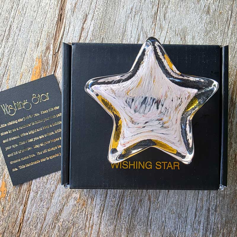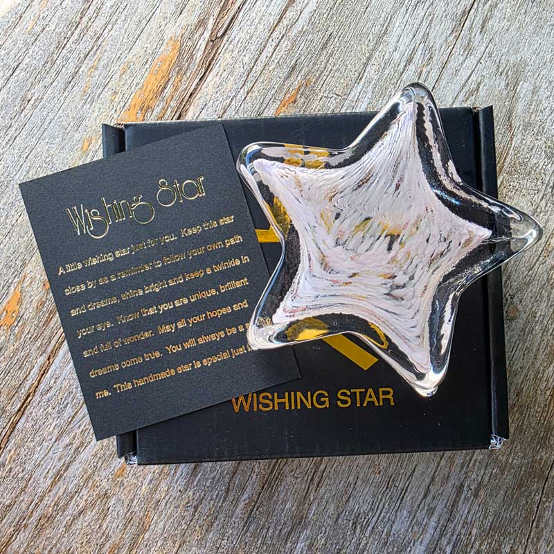 Show someone how much you care with this beautiful handmade wishing star! This lovely glass star has been hand made and mouth blown to create a one of a kind piece, perfect for a one of a kind friend, family member, partner or loved one!