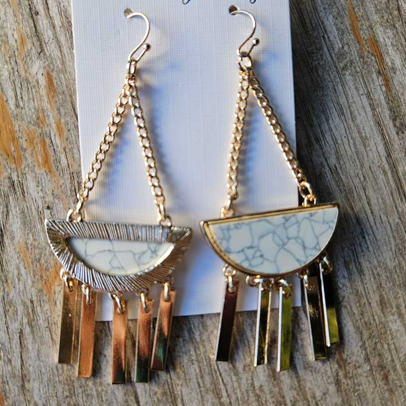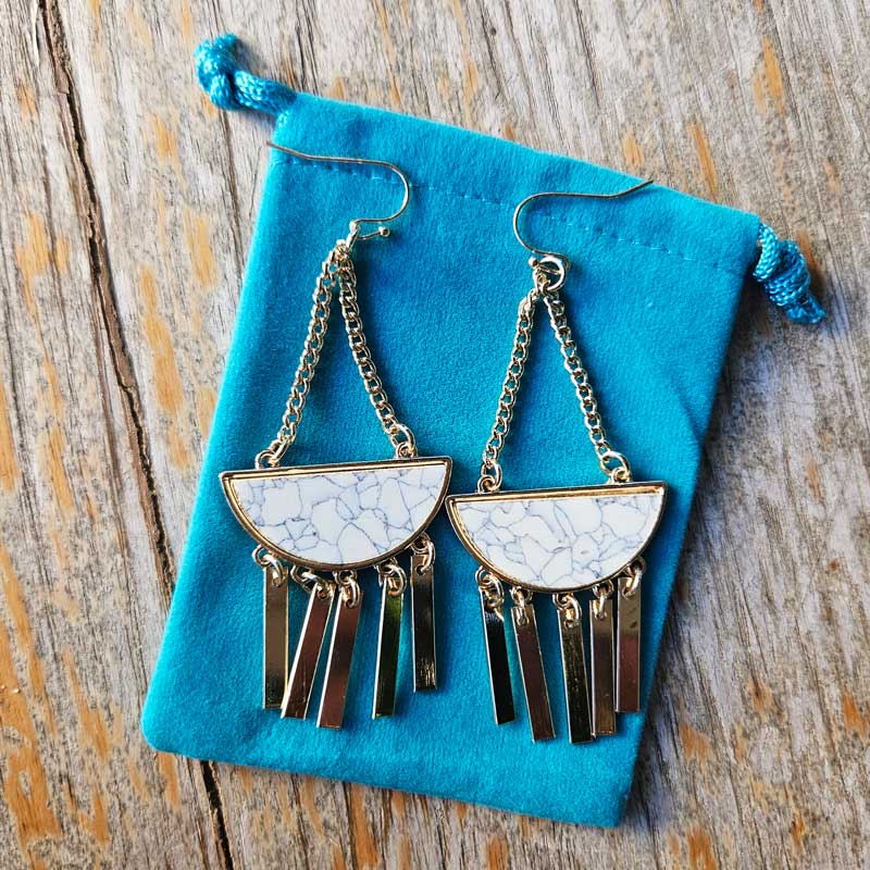 A stunning pair of handcrafted earrings in a gold patterned inlay design.