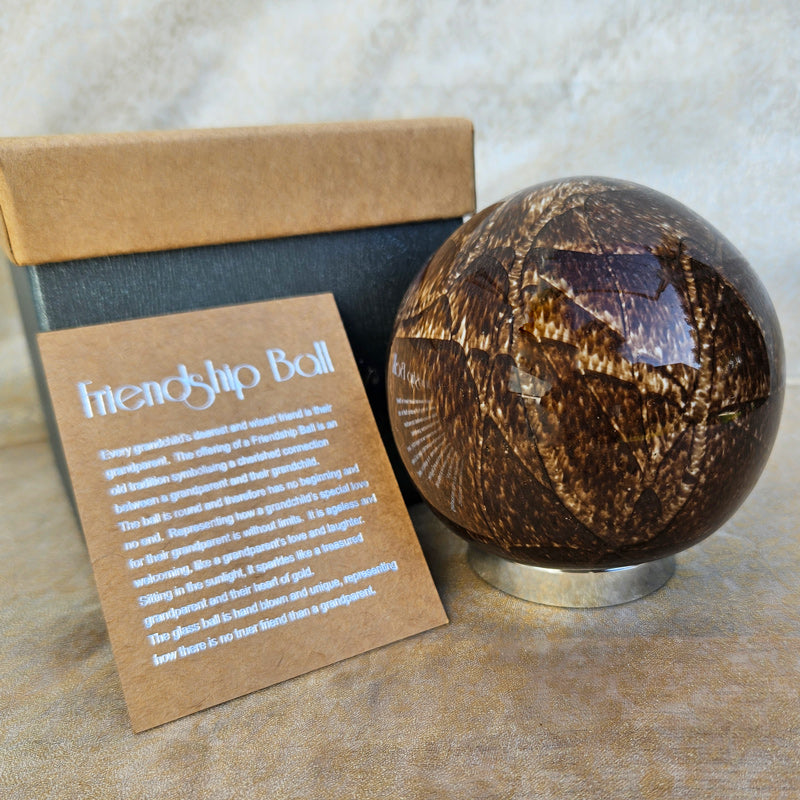“Every grandchild's dearest and wisest friend is their grandparent. The offering of a Friendship Ball is an old tradition symbolising a cherished connection between a grandparent and their grandchild. The ball is round and therefore has no beginning and no end. Representing how a grandchild's special love for their grandparent is without limits. It is ageless and welcoming, like a grandparent’s love and laughter. Sitting in the sunlight, it sparkles like a treasured grandparent and their heart of gold. The glass ball is hand blown and unique, representing how there is no truer friend than a grandparent.”