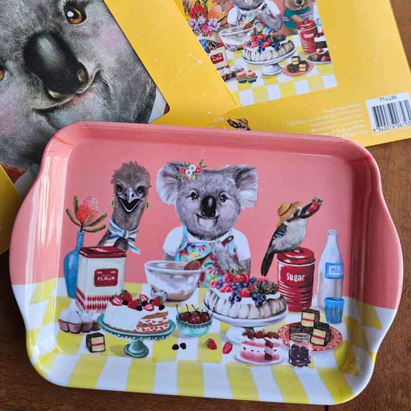 The perfect gift for visitors to Australia or overseas friends and family. A light weight tray that's perfect for a take-home souvenir. Showcasing an adorable scene of a cute koala baking up a sugary sweet afternoon tea with the help of her fuzzy friends.