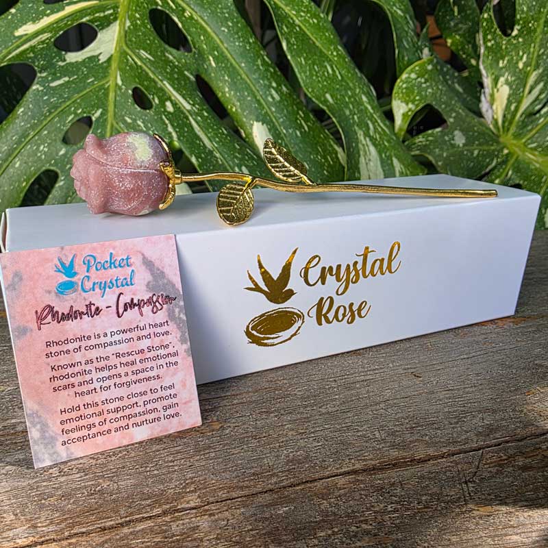 Includes a crystal & metal rose and a card with the crystal's unique meaning and properties.