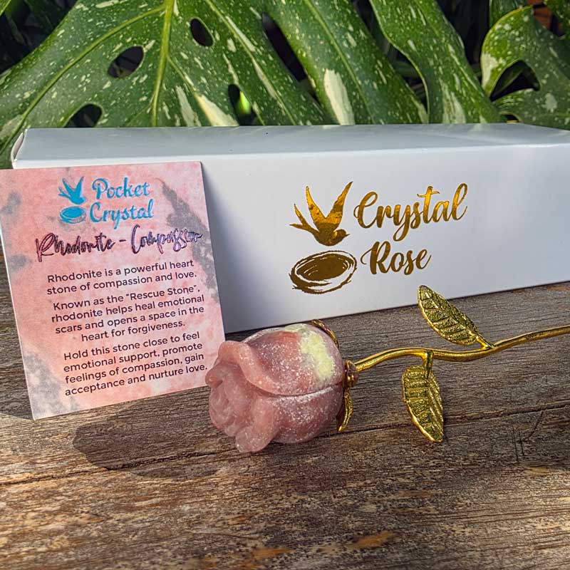 - Includes Rhodonite rose crystal and card with crystal properties and meaning