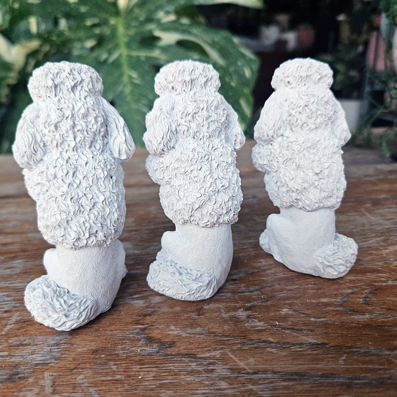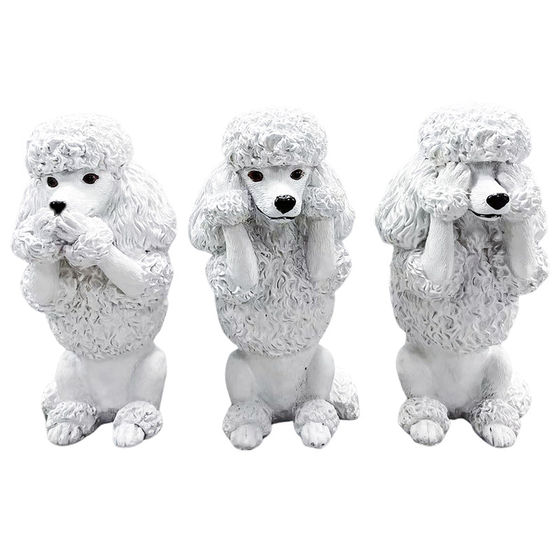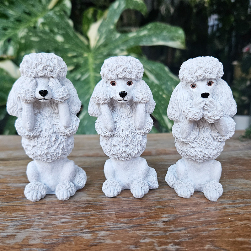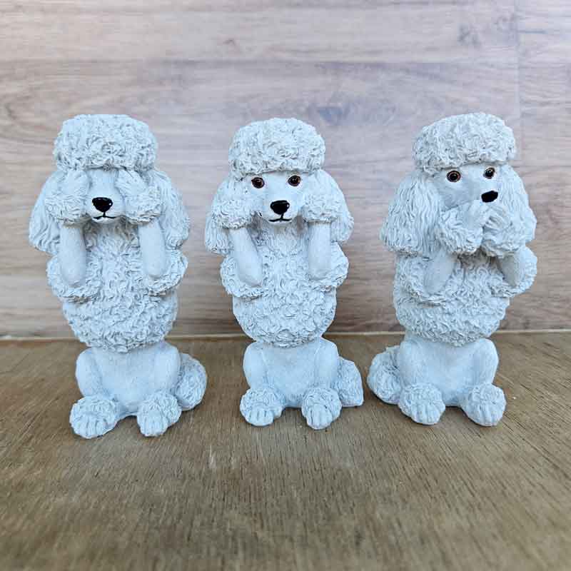 This trio of wise poodles represents the old saying "See no evil, hear no evil, speak no evil".