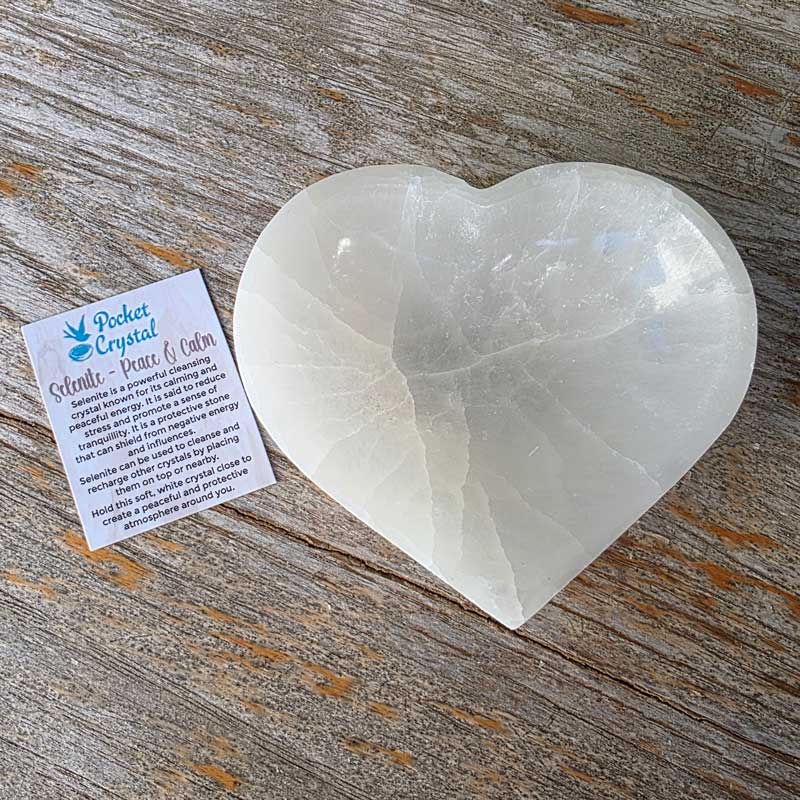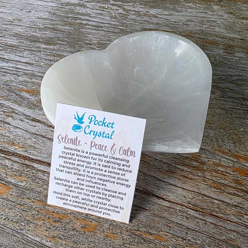 - Includes selenite heart trinket dish, crystal card with crystal properties and meaning