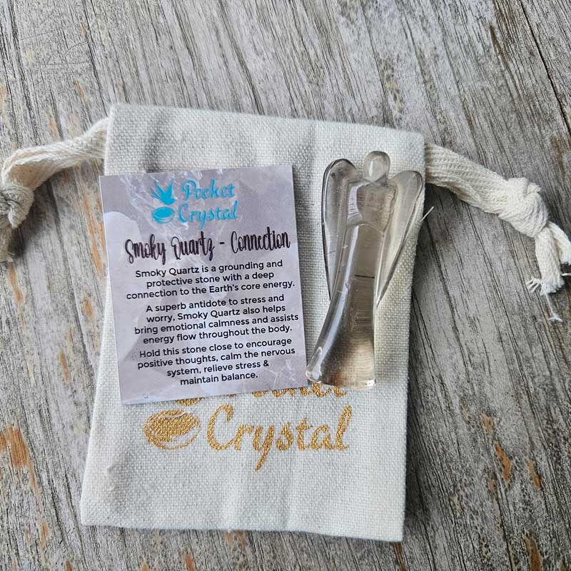 - Includes smoky quartz angel crystal, card with crystal properties and meaning and fabric drawstring bag.