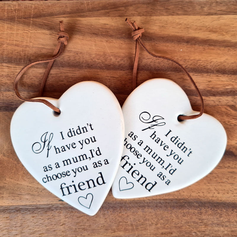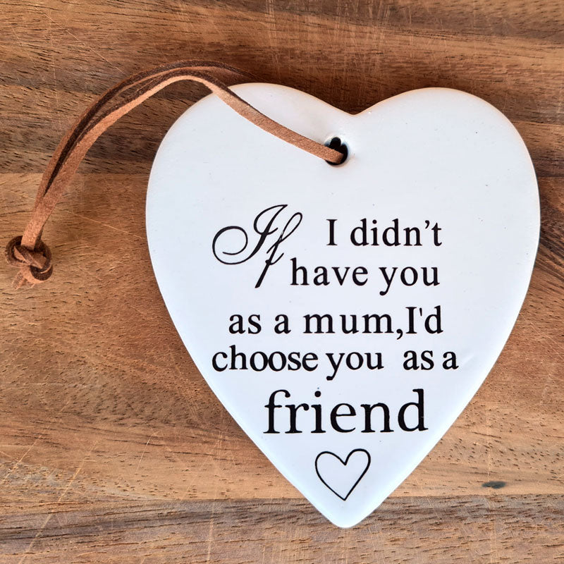 A cute hanging heart ornament with the beautiful words "If I didn't have you as a mum, I'd choose you as a friend". This heartfelt message is the perfect little gift for your mum.